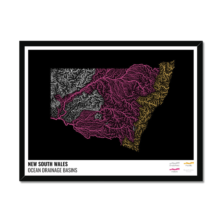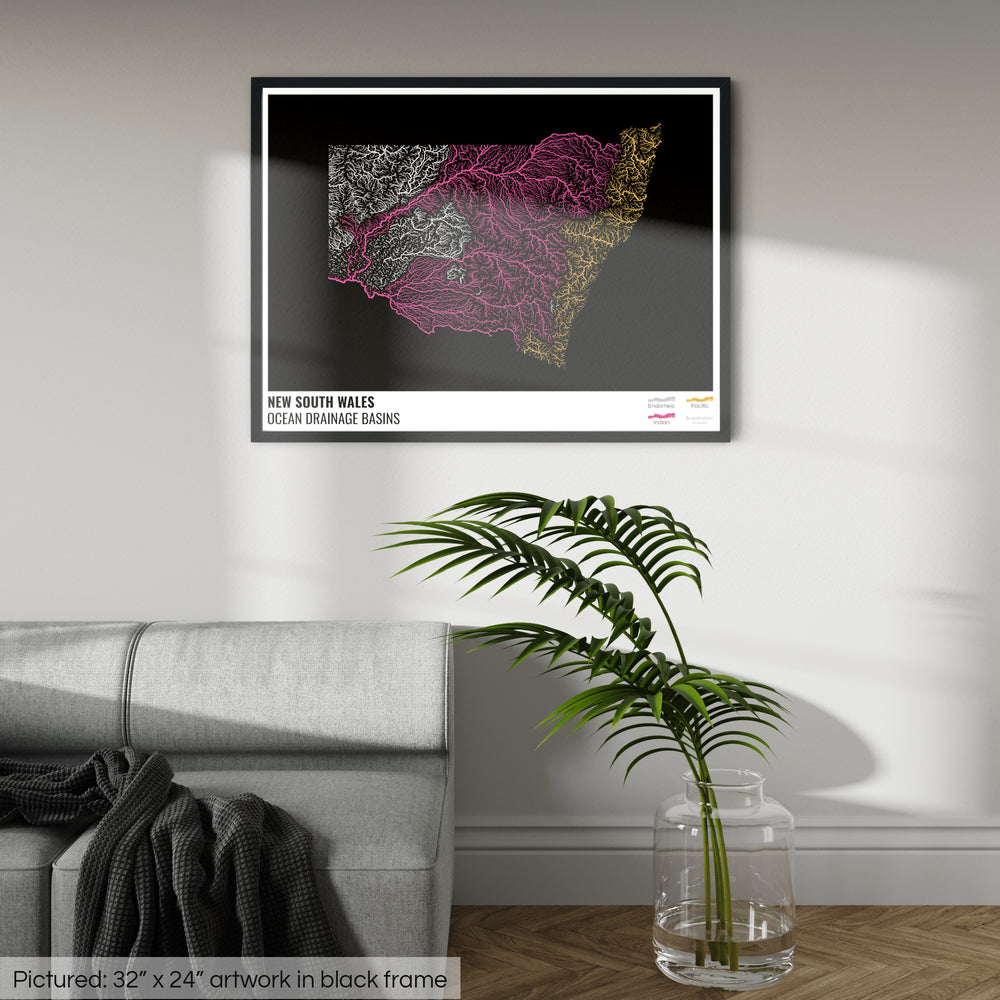 New South Wales - Ocean drainage basin map, black with legend v1 - Framed Print. The world's first high resolution, scientifically accurate map art that shows all permanent and temporary streams and rivers, colour-coded according to the ocean they end up in. With the help of these maps we gain a deeper understanding of the complex hydrological systems that sustain life on our planet. By displaying this print in your home or office, you bring a touch of nature into your space. But this map is more than just data transformed into art: it also sparks curiosity and serves as a great conversation starter, inviting viewers to raise questions about our natural environment through the fascinating world of rivers.