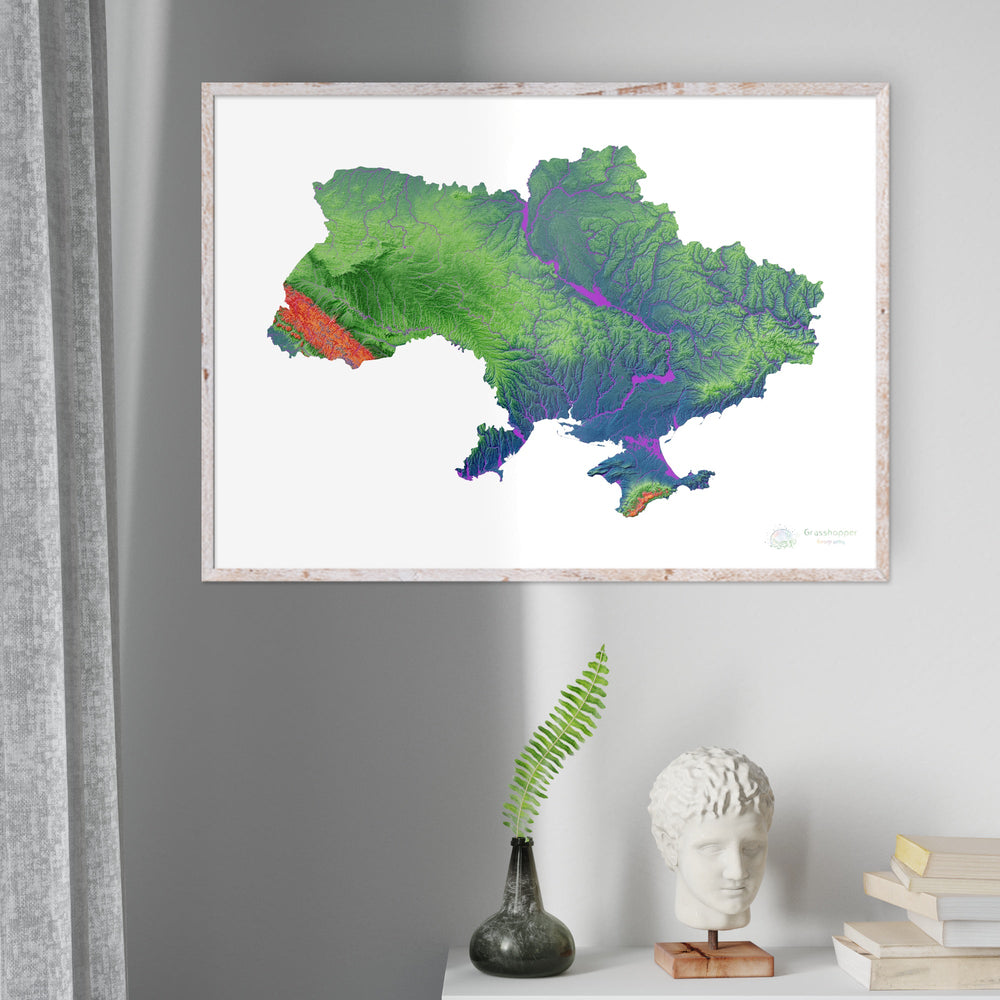 Elevation map of Ukraine with white background Fine Art Print. High resolution elevation map in a unique colour scheme, based on digital elevation models generated from satellite data.