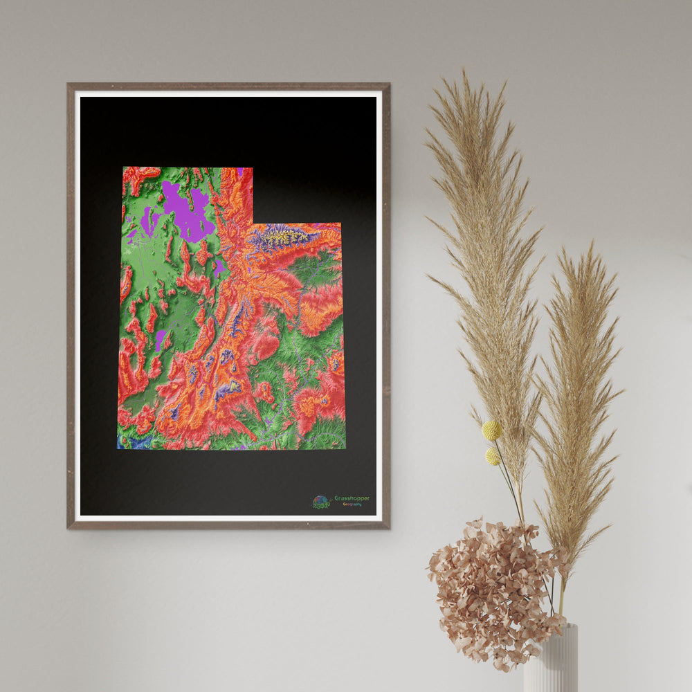 Elevation map of Utah with black background Fine Art Print. High resolution elevation map in a unique colour scheme, based on digital elevation models generated from satellite data.