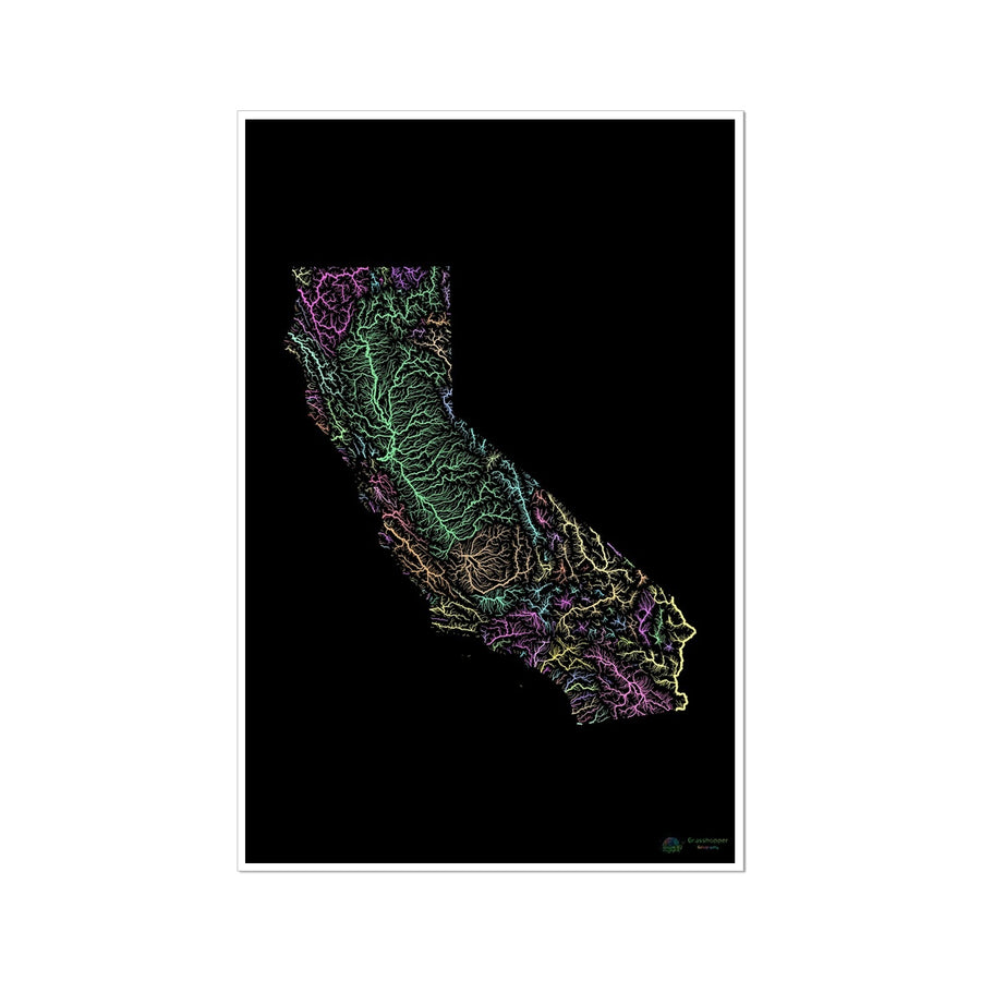 CUSTOM River basin map of California pastel on black Photo Art Print