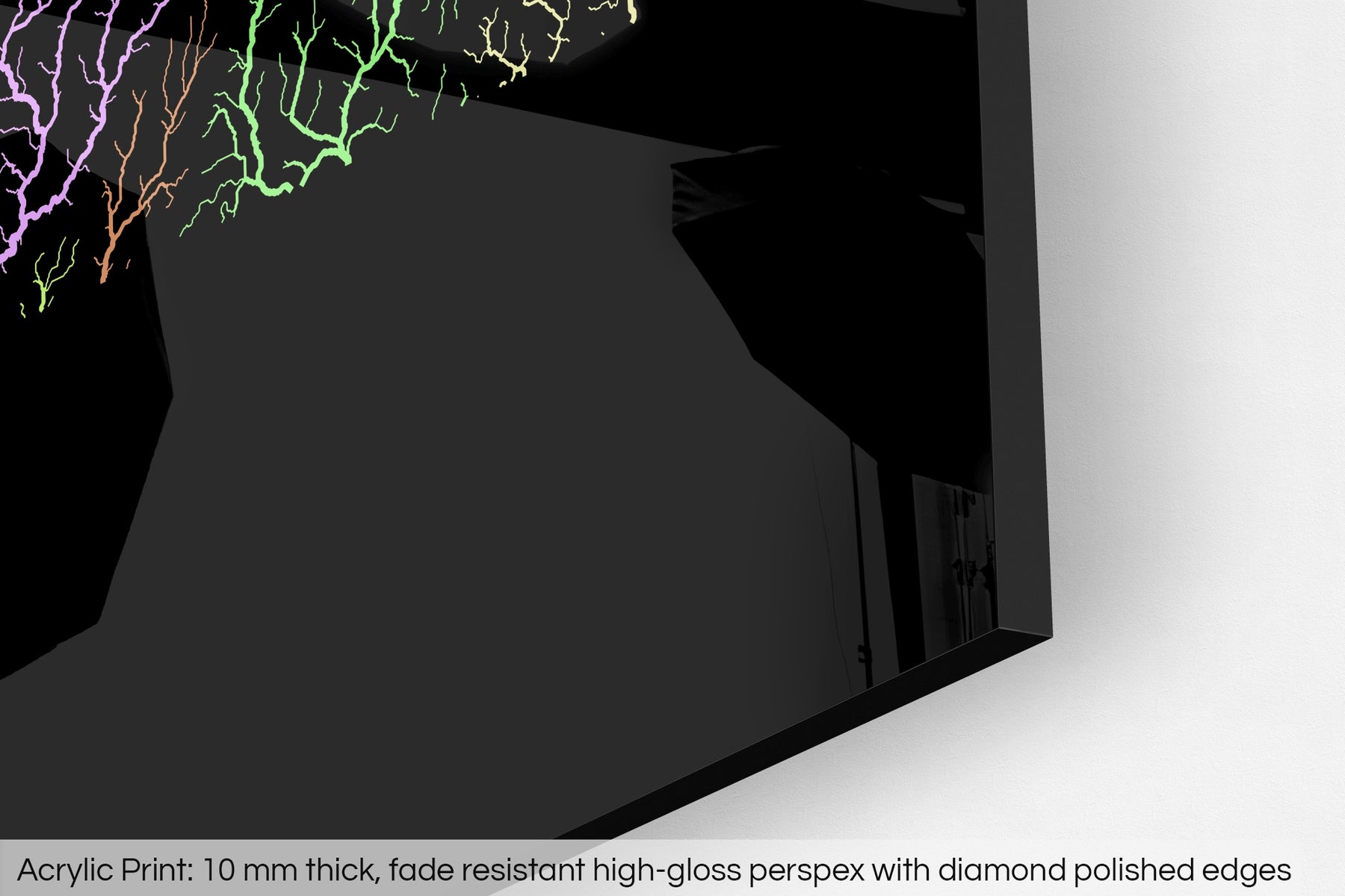 The fine art Giclée print is hand mounted onto a 10mm thick, premium polished, high-gloss acrylic glass that results in a vibrant finish. The transparency of the acrylic enhances the colours and details of the artwork, creating a stunning visual effect that will make a bold statement in any space.