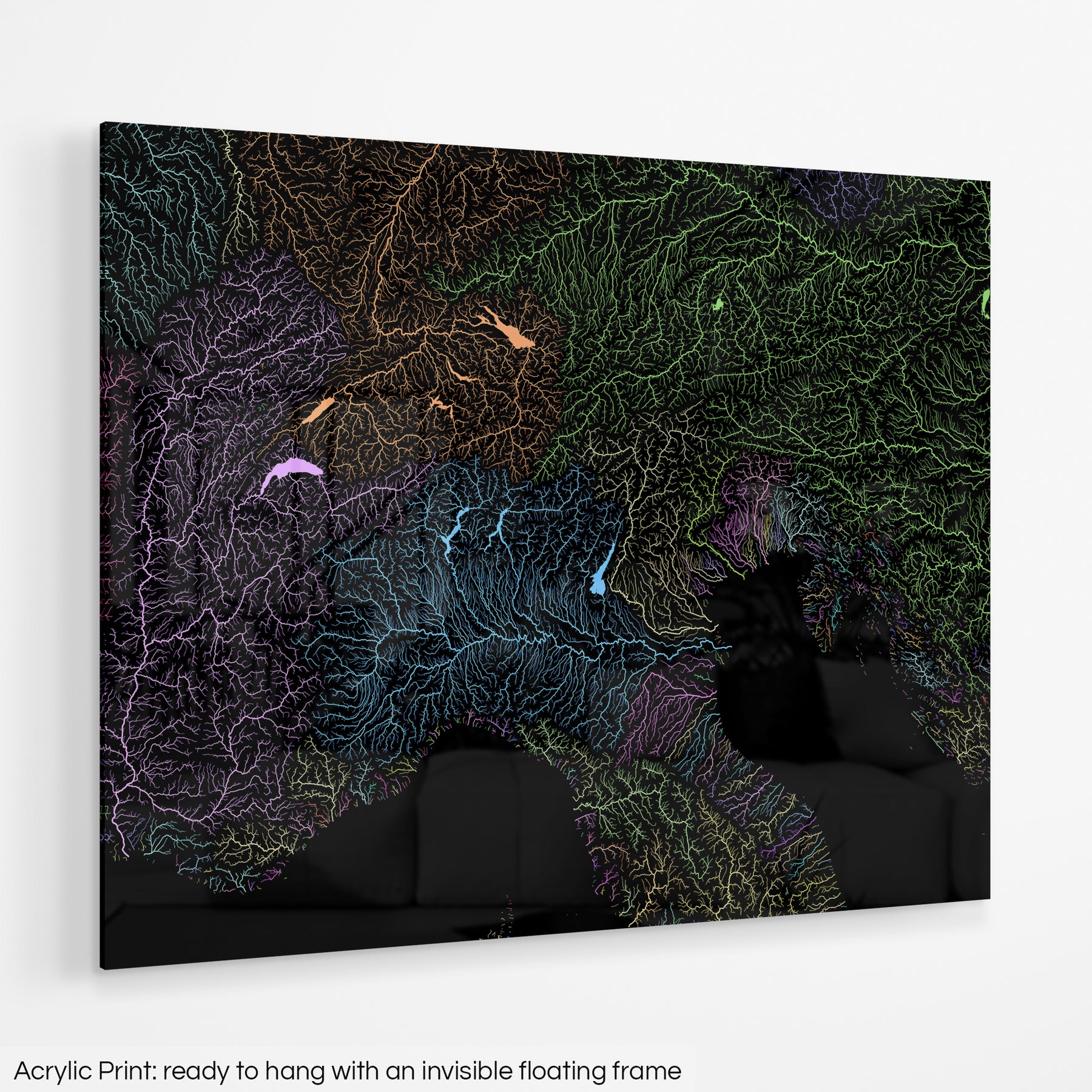 High resolution river basin map, showing each catchment area in a different colour. Thanks to its soft pastel tones the map fits well into most interiors.