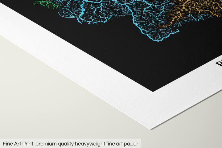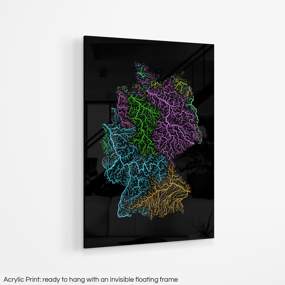 This high-resolution river basin map shows each catchment area in a different colour. Its vibrant colour scheme makes this map a lively addition to any space.
