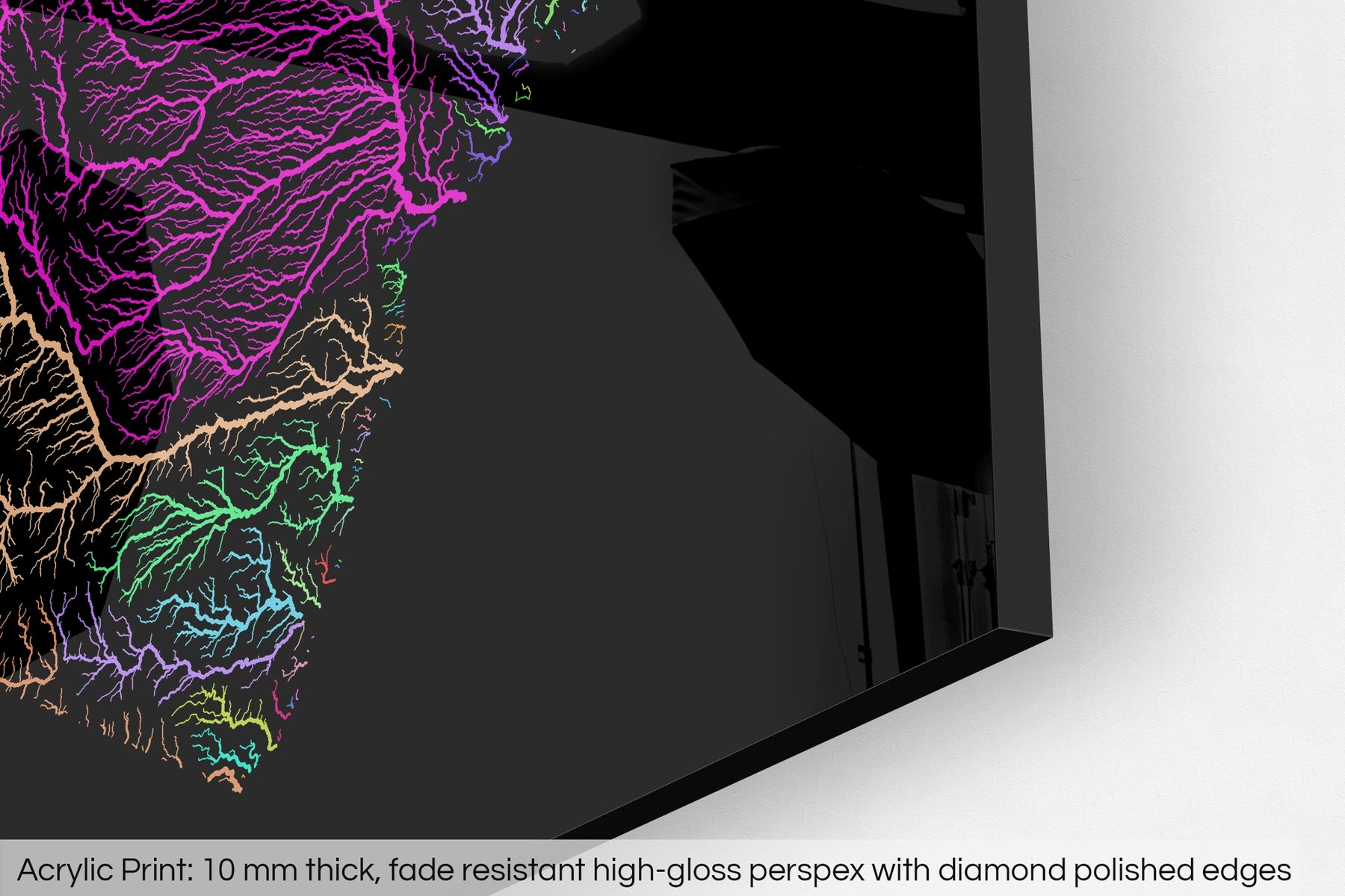 This high-resolution river basin map shows each catchment area in a different colour. Its vibrant colour scheme makes this map a lively addition to any space.
