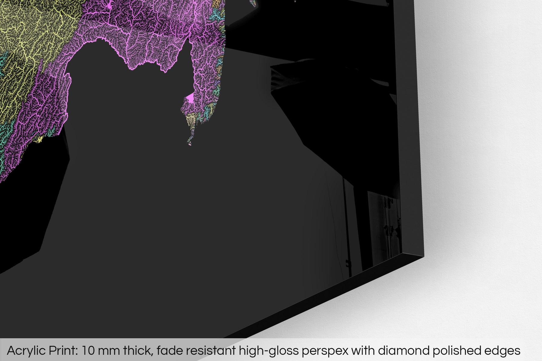 High resolution river basin map, showing each catchment area in a different colour. Thanks to its soft pastel tones the map fits well into most interiors.