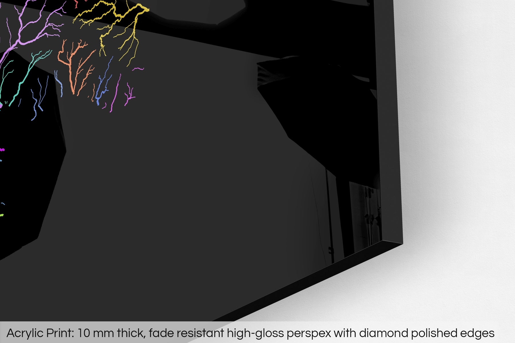 This high-resolution river basin map shows each catchment area in a different colour. Its vibrant colour scheme makes this map a lively addition to any space.