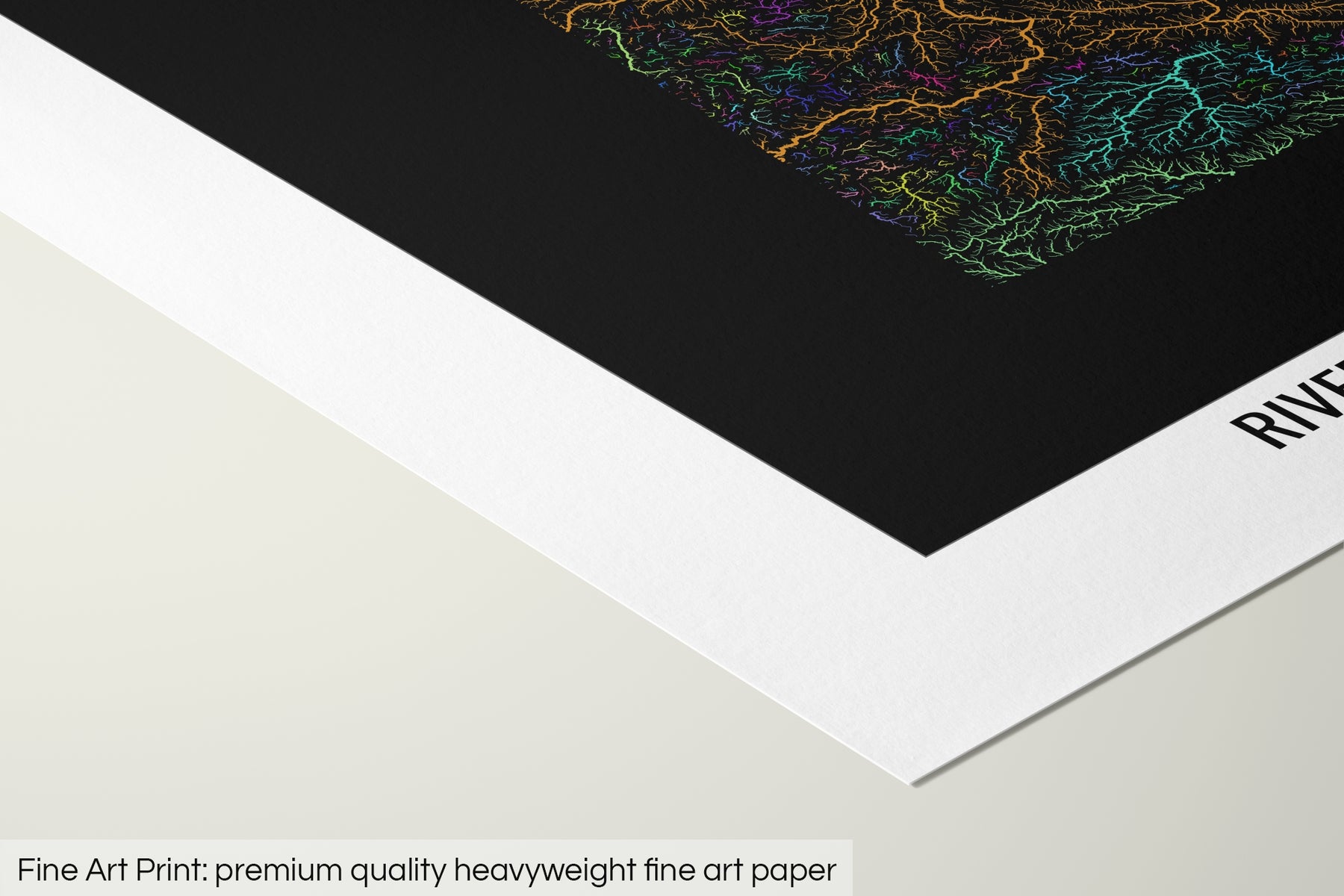 This high-resolution river basin map shows each catchment area in a different colour. Its vibrant colour scheme makes this map a lively addition to any space.