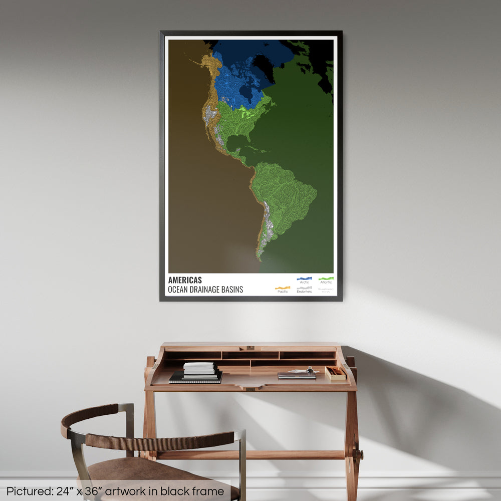 The Americas - Ocean drainage basin map, black with legend v2 - Framed Print. The world's first high resolution, scientifically accurate map art that shows all permanent and temporary streams and rivers, colour-coded according to the ocean they end up in. With the help of these maps we gain a deeper understanding of the complex hydrological systems that sustain life on our planet. By displaying this print in your home or office, you bring a touch of nature into your space. But this map is more than just data transformed into art: it also sparks curiosity and serves as a great conversation starter, inviting viewers to raise questions about our natural environment through the fascinating world of rivers.