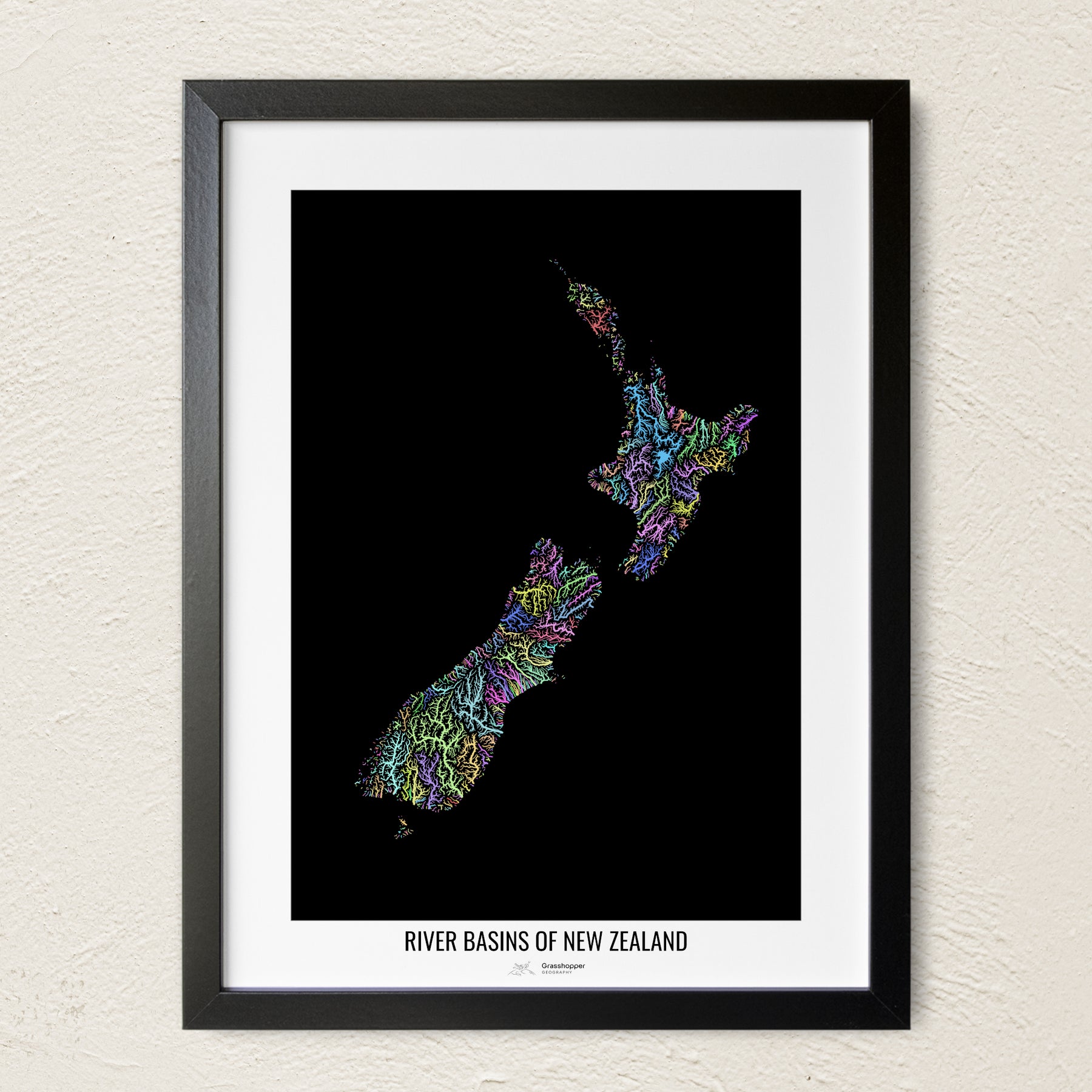 Neuseeland – Karte der Flussgebiete, Pastellfarben – Wandbild