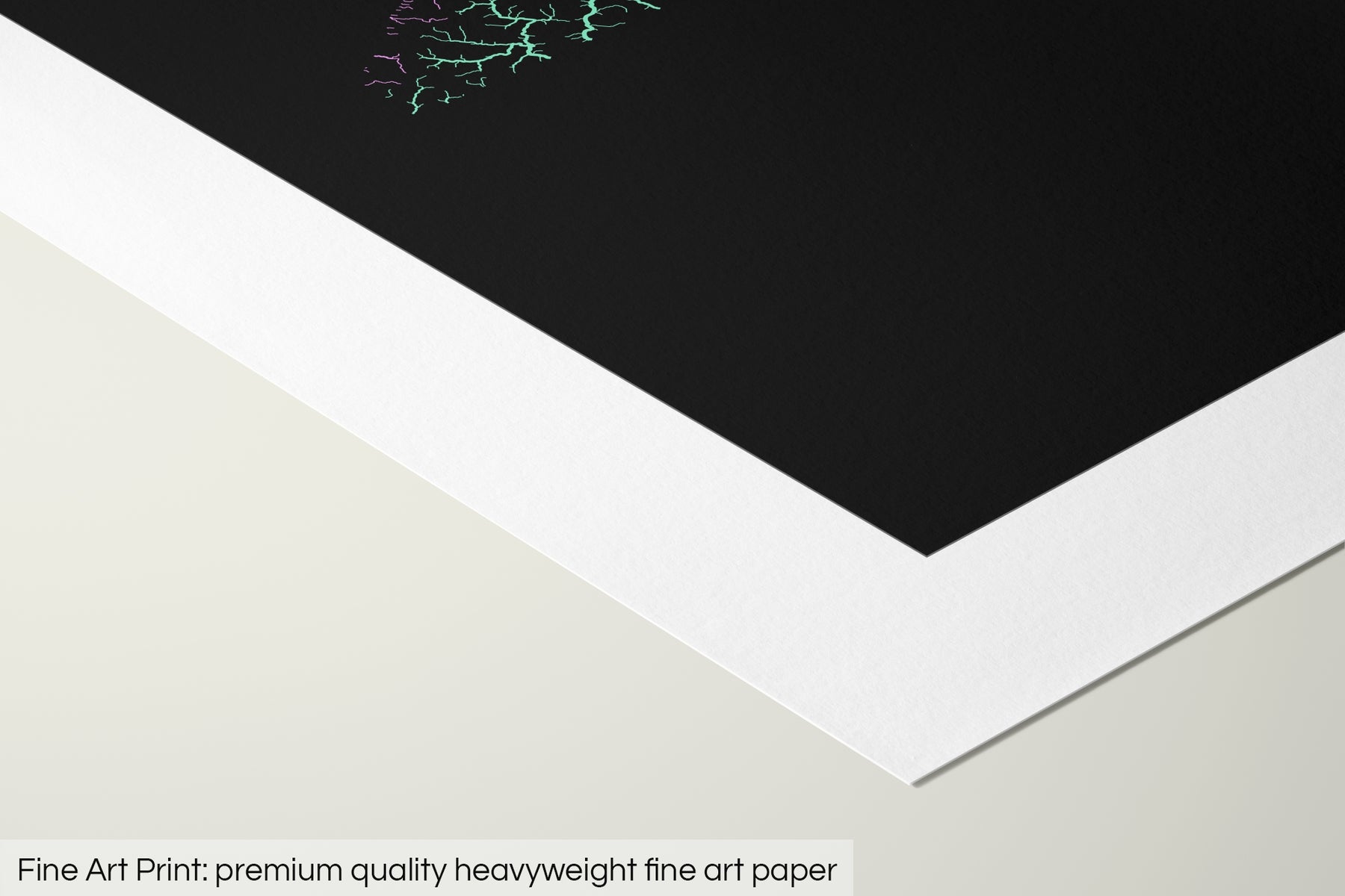 Das hochwertige Kunstdruckpapier in Museumsqualität weist filigrane Details auf, und der professionelle Giclée-Druck sorgt für tiefste Schwarztöne und lebendigste Farben. Die Rahmen werden aus nachhaltig gewonnenem Holz gefertigt und sind in verschiedenen Farben erhältlich, die zu Ihrer Karte und Ihrem Interieur passen.