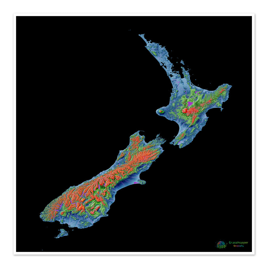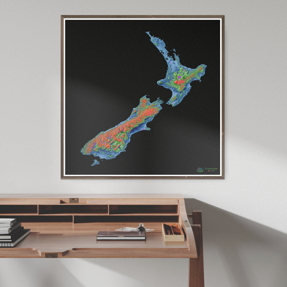 Mapa de elevación de Nueva Zelanda con fondo negro Impresión de bellas artes. Mapa de elevación de alta resolución en una combinación de colores única, basado en modelos de elevación digitales generados a partir de datos satelitales.