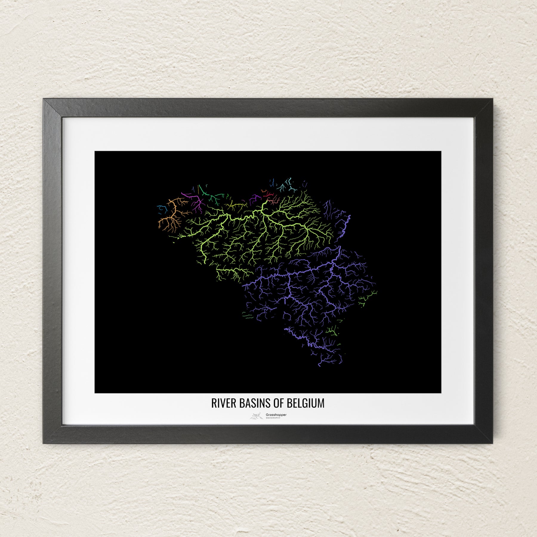 Bélgica - Mapa de cuencas fluviales, colores del arcoíris - Arte mural