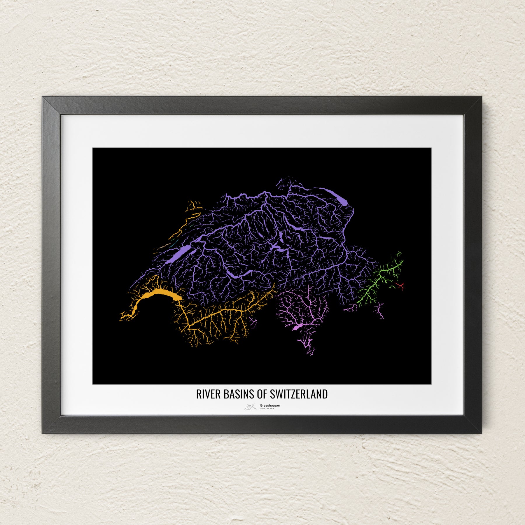 Suiza - Mapa de cuencas fluviales, colores del arcoíris - Arte mural
