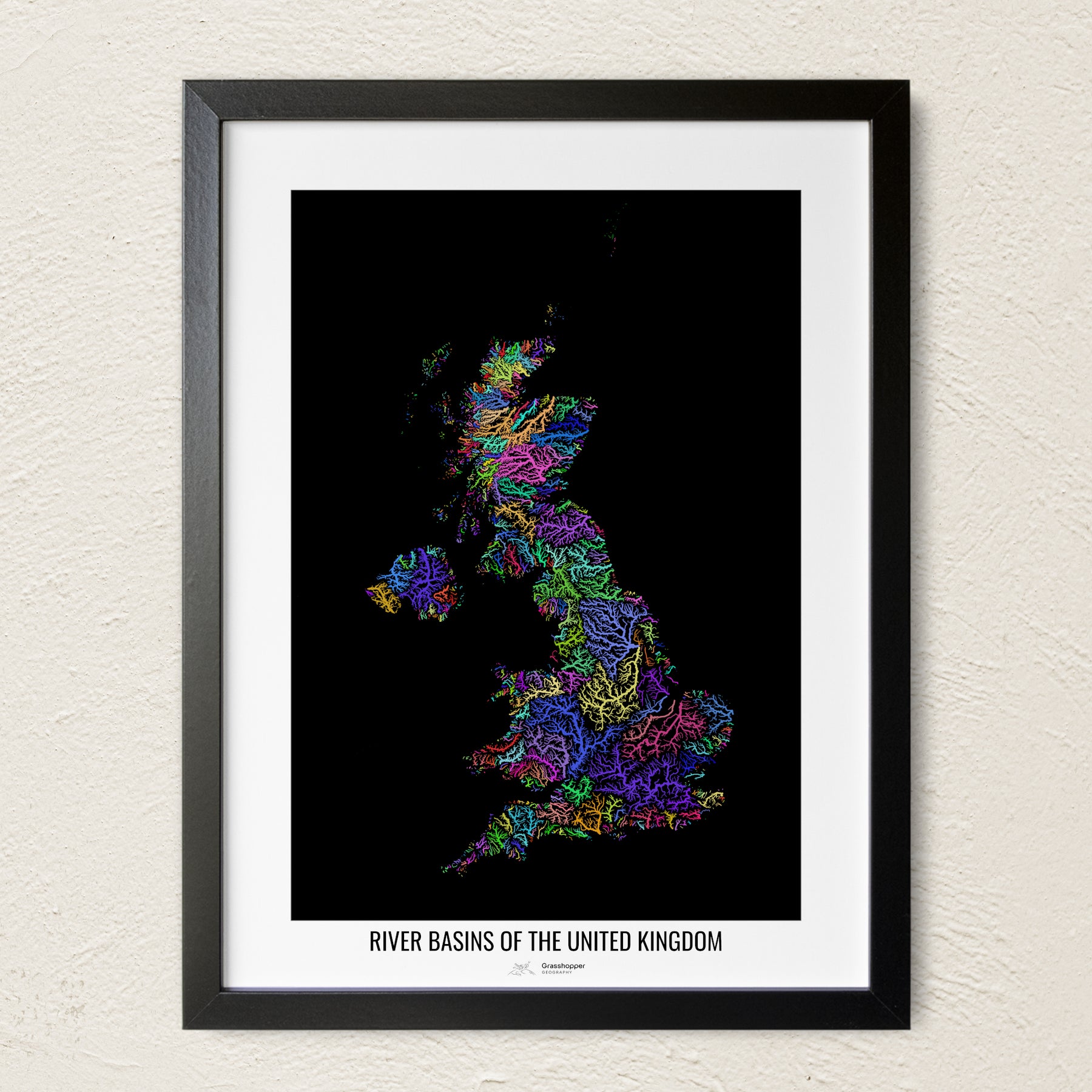 Reino Unido - Mapa de cuencas fluviales, colores del arcoíris - Arte mural