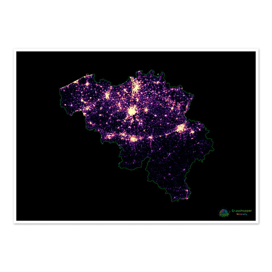 Mapa de calor de densidad de población de Bélgica Fine Art Print. Mapa de densidad de población de alta resolución basado en conjuntos de datos globales detallados, diseñado para parecerse a constelaciones de estrellas y nebulosas. Los colores más oscuros representan áreas de muy baja densidad, los amarillos son centros urbanos densos y los morados en el medio.