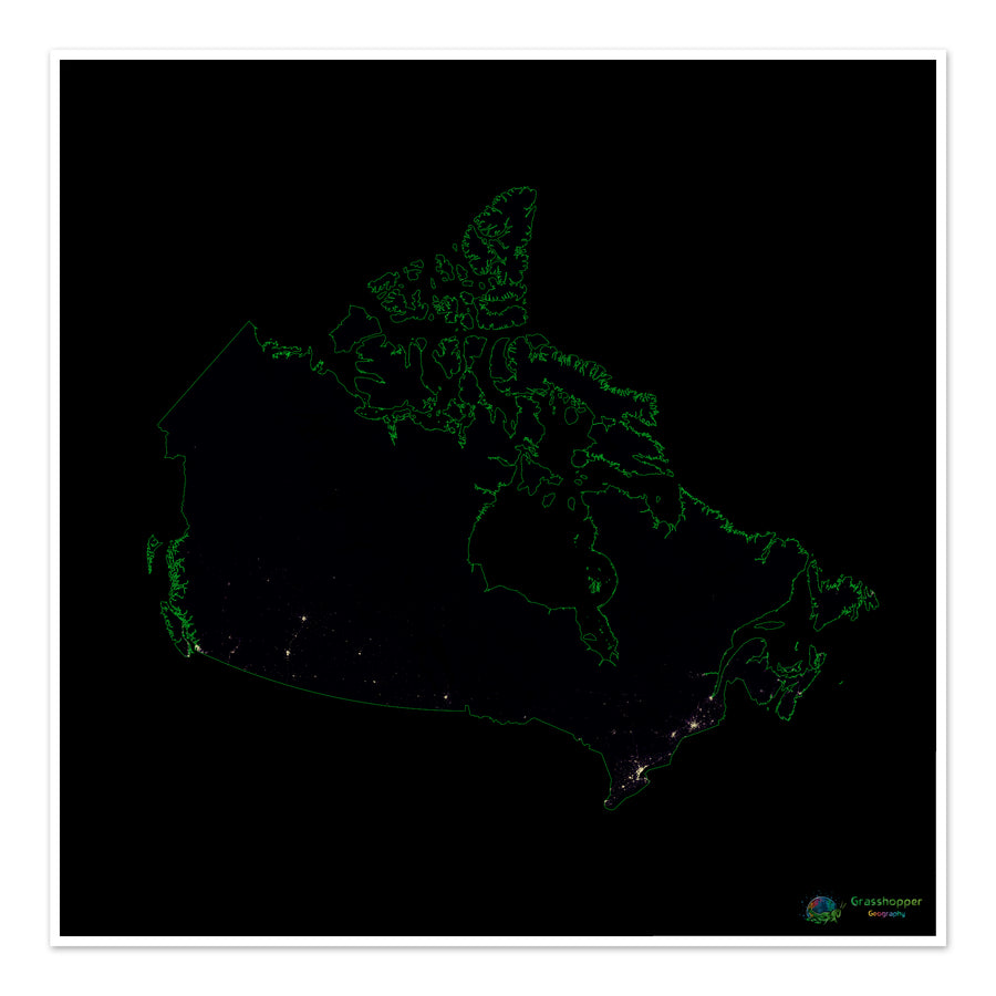 Mapa de calor de densidad de población de Canadá Fine Art Print. Mapa de densidad de población de alta resolución basado en conjuntos de datos globales detallados, diseñado para parecerse a constelaciones de estrellas y nebulosas. Los colores más oscuros representan áreas de muy baja densidad, los amarillos son centros urbanos densos y los morados en el medio.
