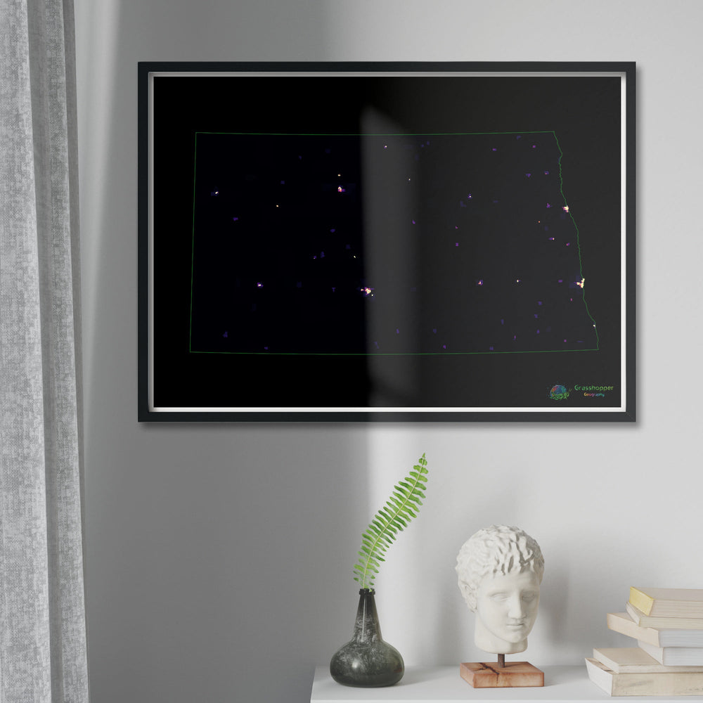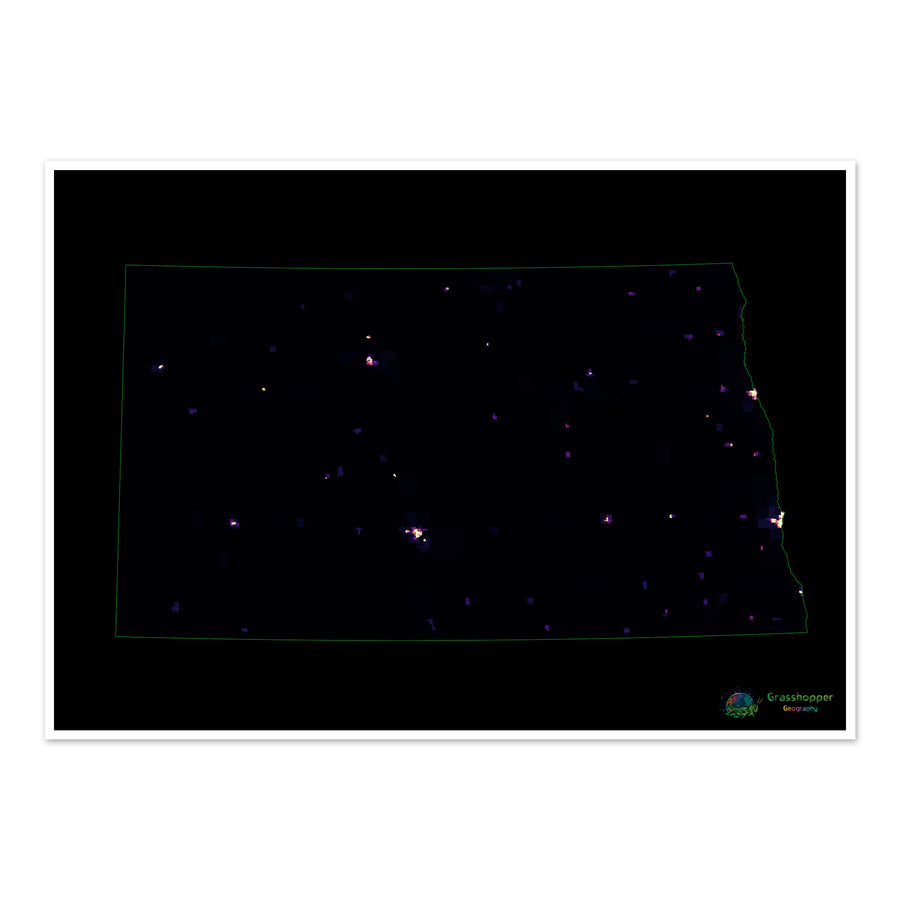 Mapa de calor de densidad de población de la impresión artística de Dakota del Norte. Mapa de densidad de población de alta resolución basado en conjuntos de datos globales detallados, diseñado para parecerse a constelaciones de estrellas y nebulosas. Los colores más oscuros representan áreas de muy baja densidad, los amarillos son centros urbanos densos y los morados en el medio.