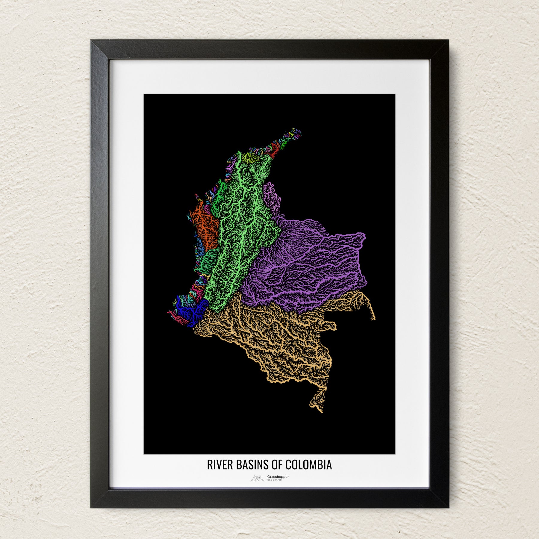 Colombia - Mapa de cuencas fluviales, colores del arcoíris - Arte mural