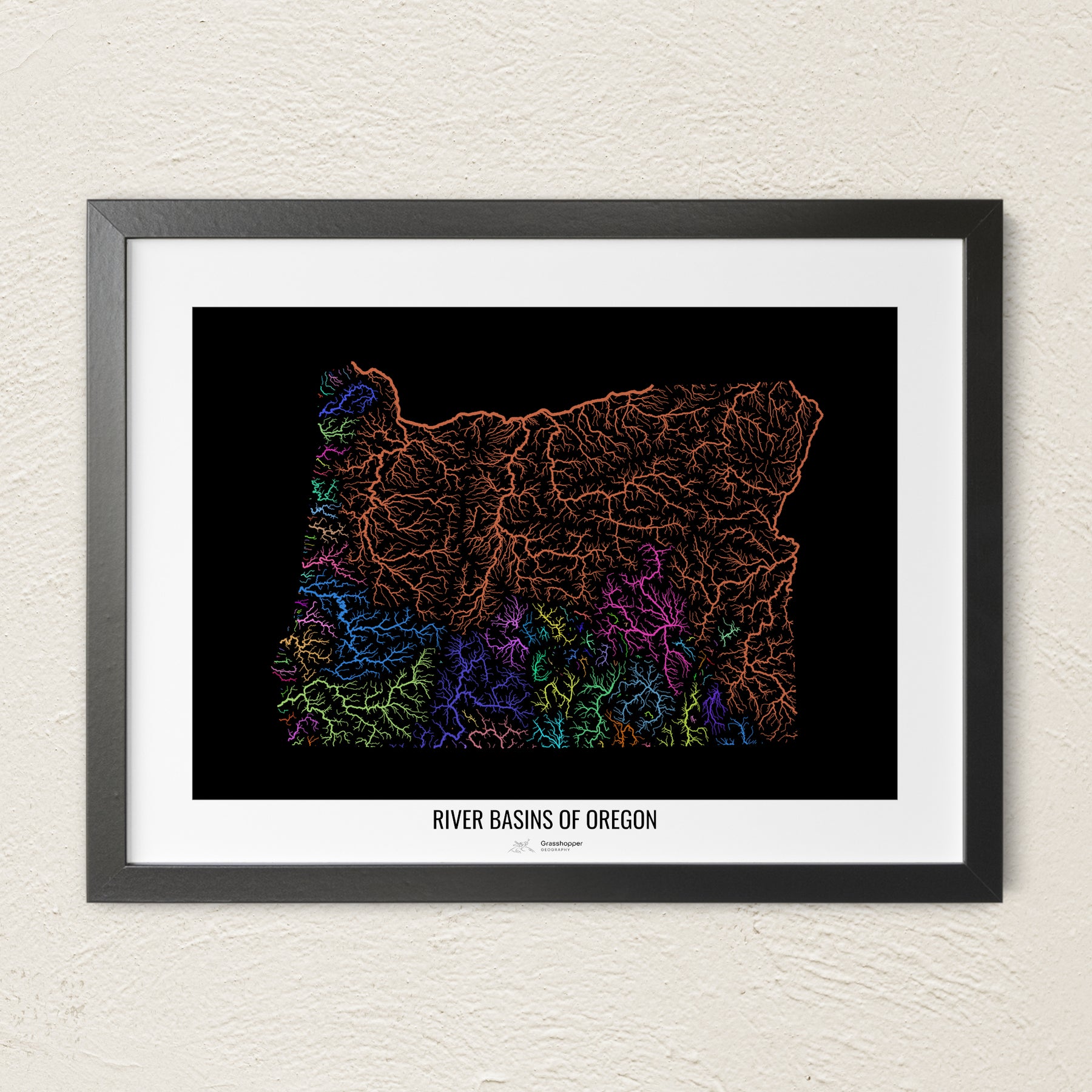 Oregón - Mapa de la cuenca del río, colores del arcoíris - Arte mural
