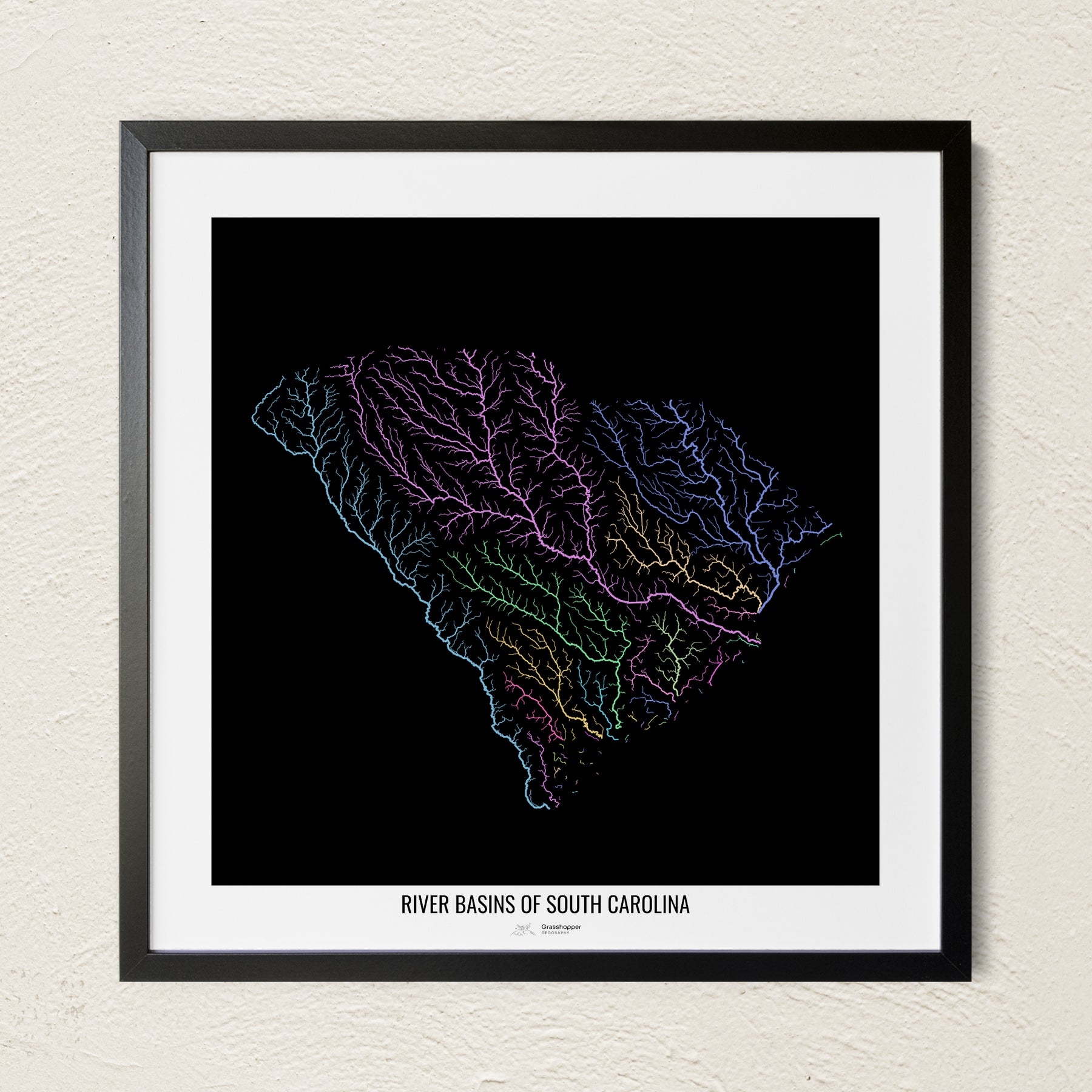 Carolina del Sur - Mapa de la cuenca del río, colores pastel - Arte mural