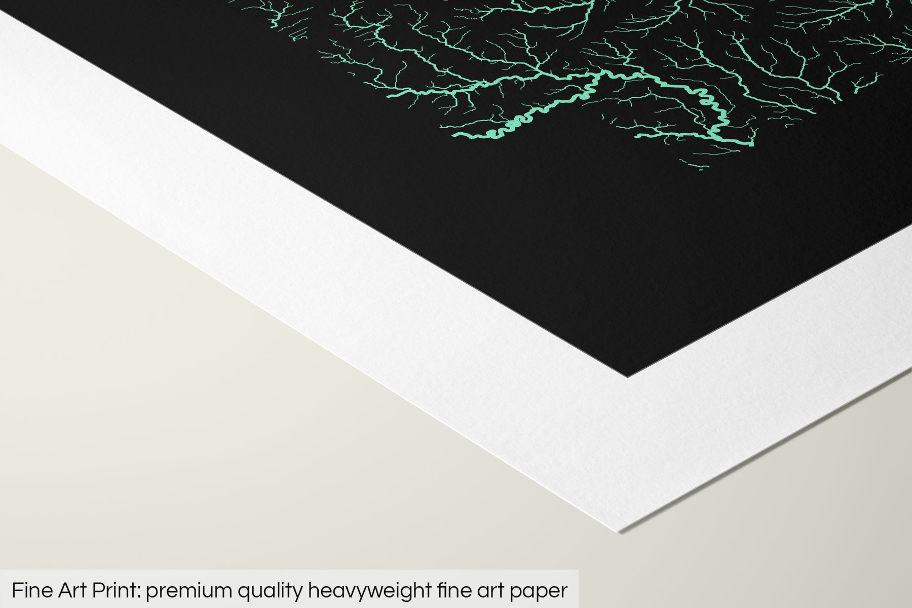 This high-resolution river basin map shows each catchment area in a different colour. Its vibrant colour scheme makes this map a lively addition to any space.