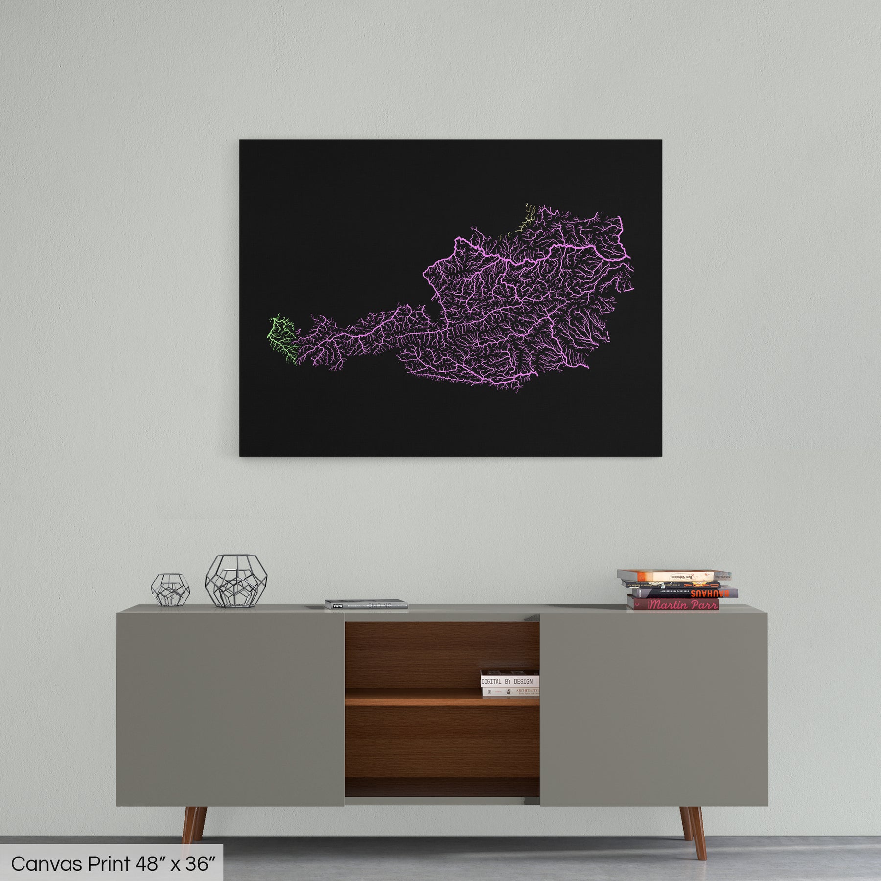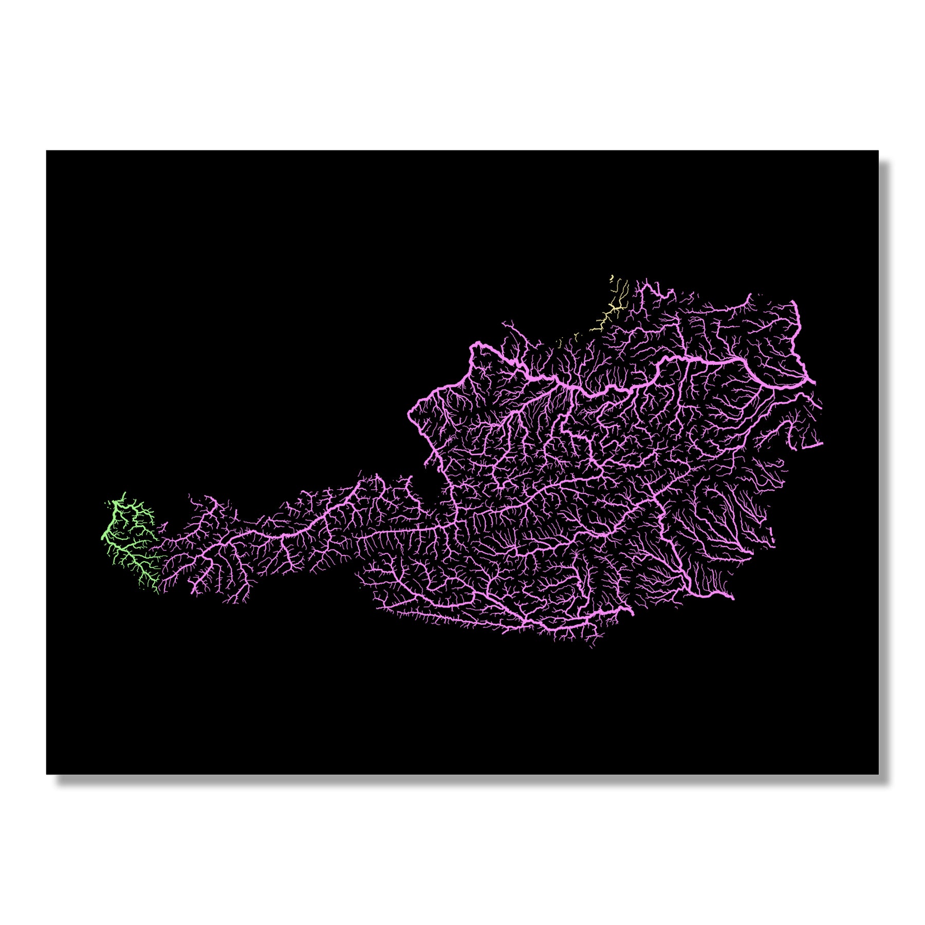 High resolution river basin map, showing each catchment area in a different colour. Thanks to its soft pastel tones the map fits well into most interiors.