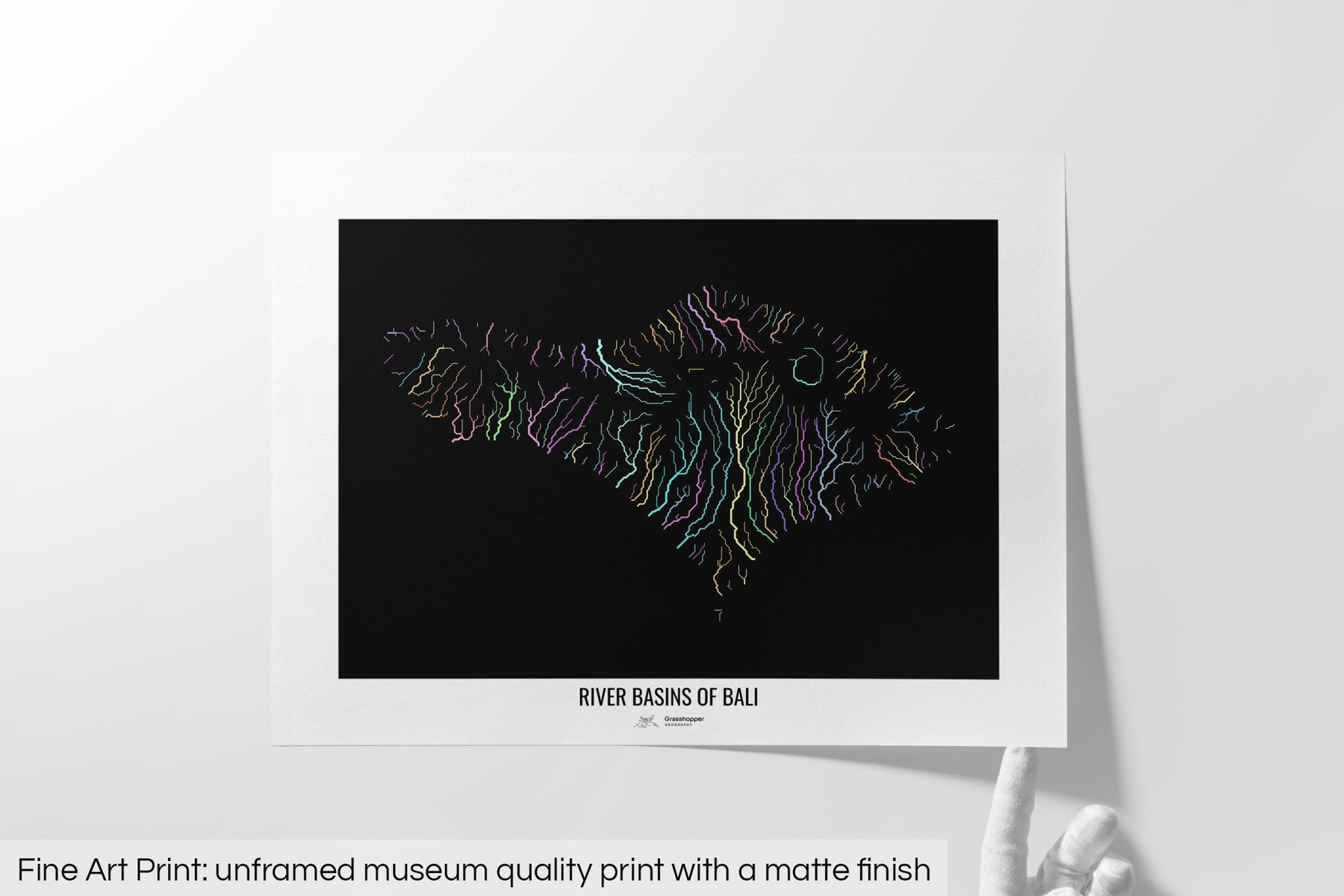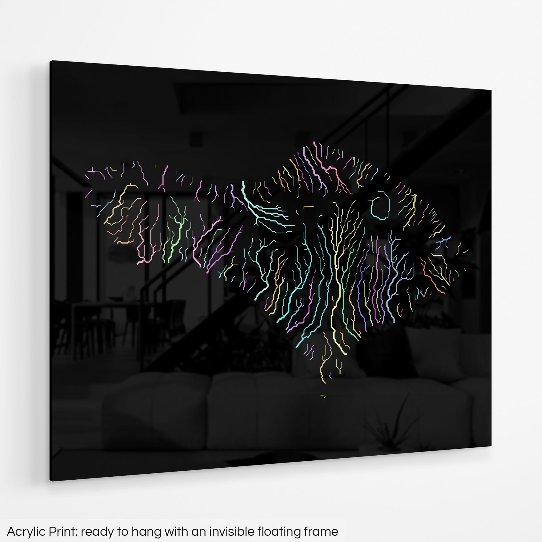 High resolution river basin map, showing each catchment area in a different colour. Thanks to its soft pastel tones the map fits well into most interiors.