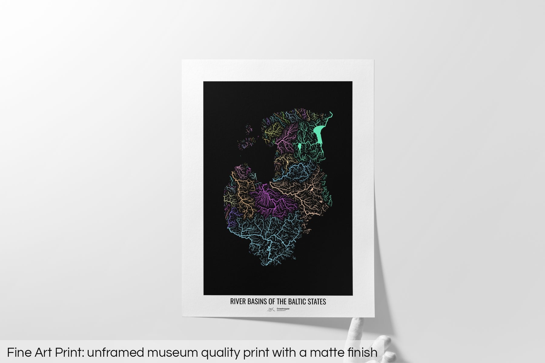 High resolution river basin map, showing each catchment area in a different colour. Thanks to its soft pastel tones the map fits well into most interiors.