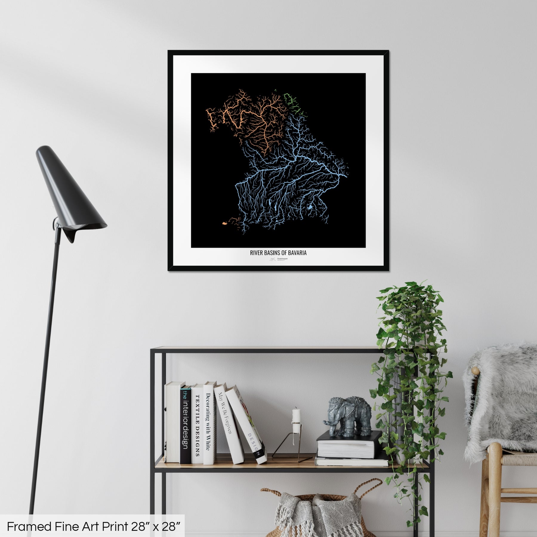 This high-resolution river basin map shows each catchment area in a different colour. Its vibrant colour scheme makes this map a lively addition to any space.