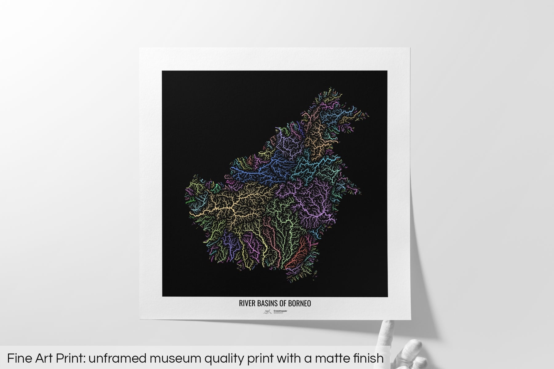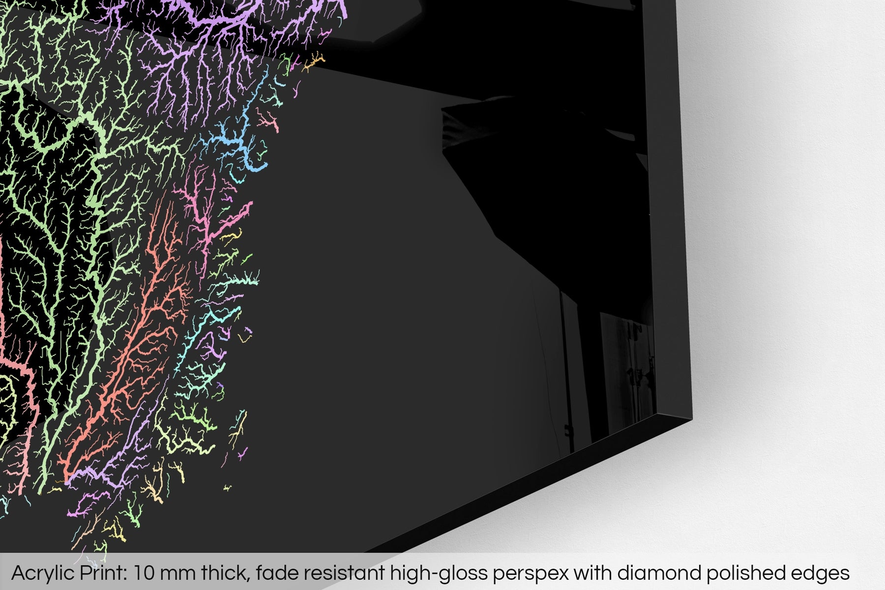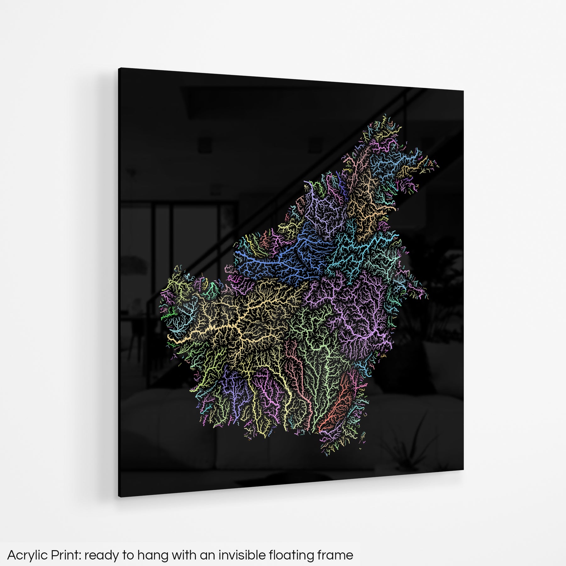 This high-resolution river basin map shows each catchment area in a different colour. Its vibrant colour scheme makes this map a lively addition to any space.