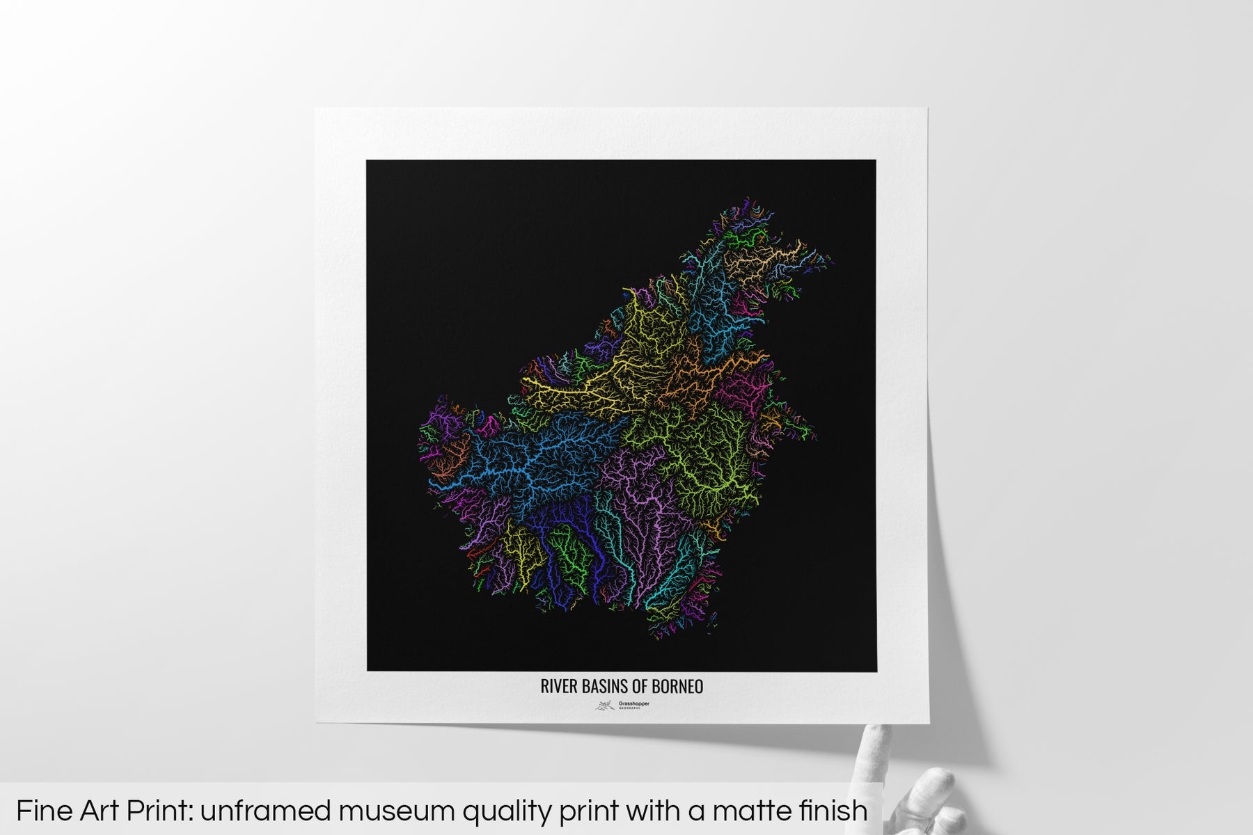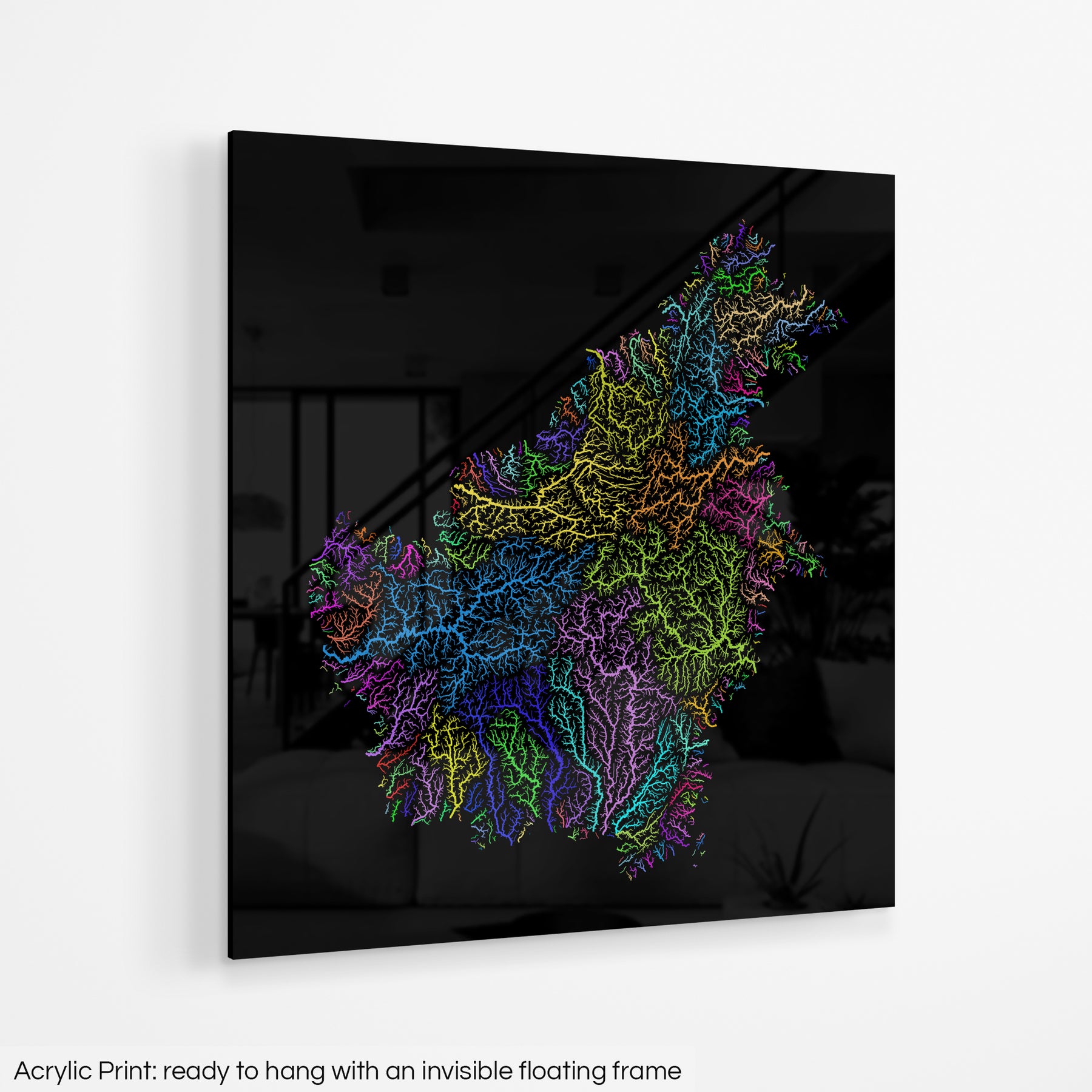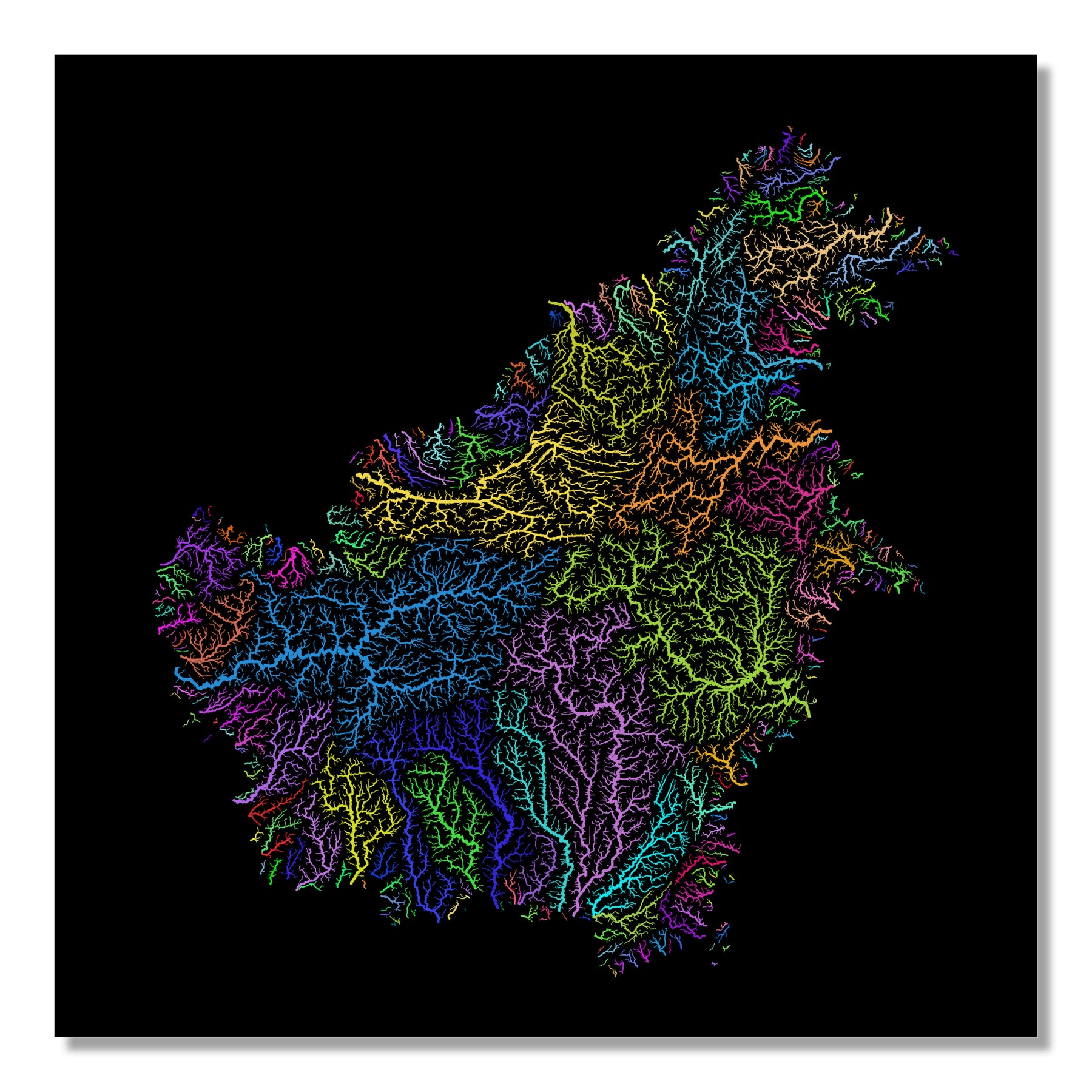 This high-resolution river basin map shows each catchment area in a different colour. Its vibrant colour scheme makes this map a lively addition to any space.