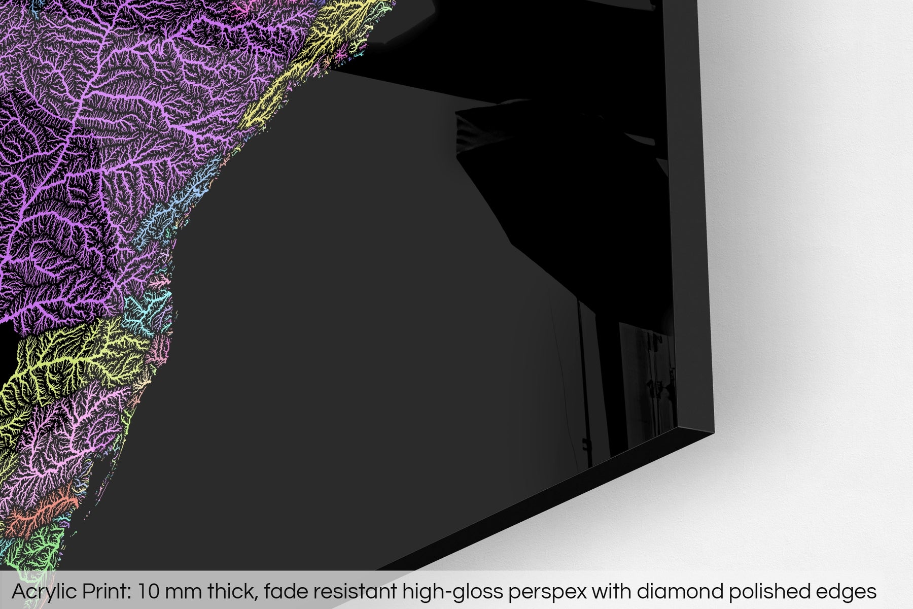 The fine art Giclée print is hand mounted onto a 10mm thick, premium polished, high-gloss acrylic glass that results in a vibrant finish. The transparency of the acrylic enhances the colours and details of the artwork, creating a stunning visual effect that will make a bold statement in any space.