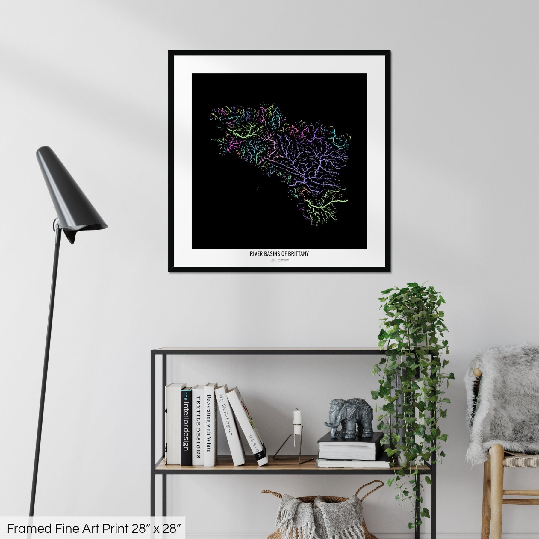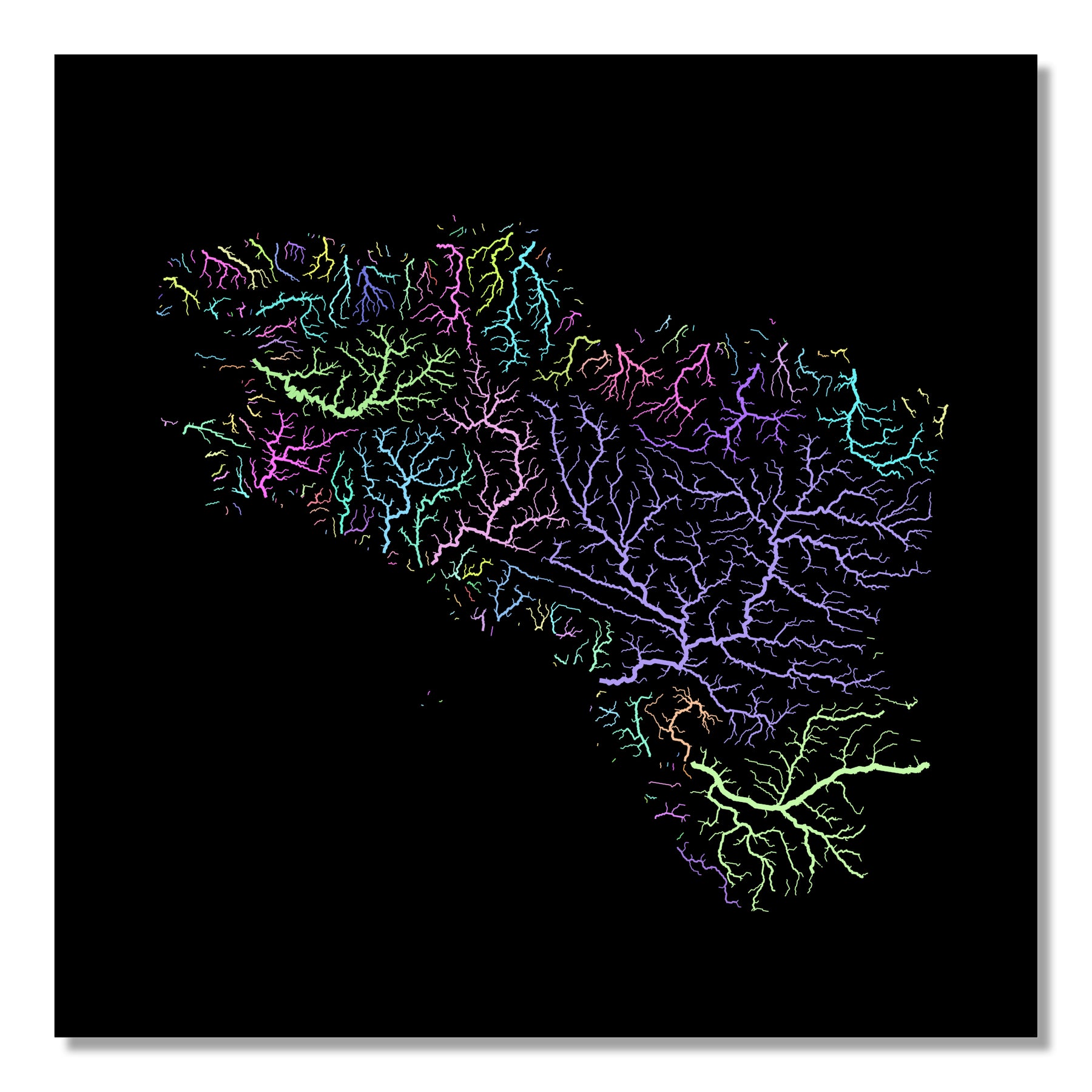 This high-resolution river basin map shows each catchment area in a different colour. Its vibrant colour scheme makes this map a lively addition to any space.