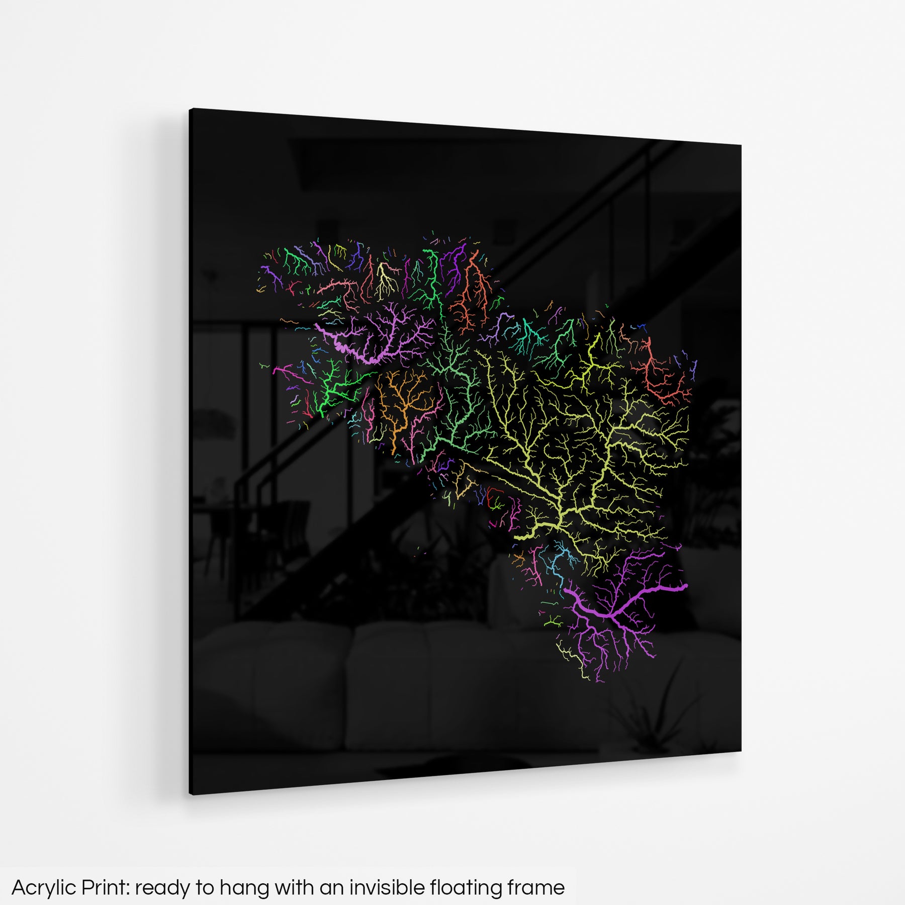 This high-resolution river basin map shows each catchment area in a different colour. Its vibrant colour scheme makes this map a lively addition to any space.