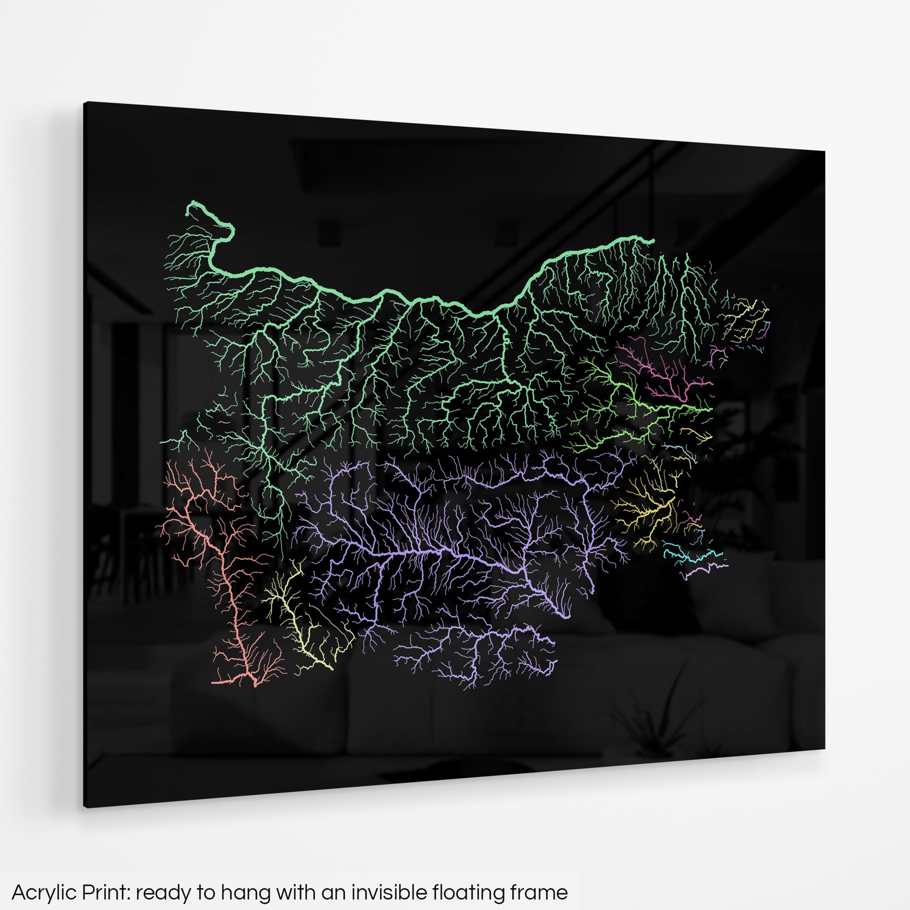High resolution river basin map, showing each catchment area in a different colour. Thanks to its soft pastel tones the map fits well into most interiors.