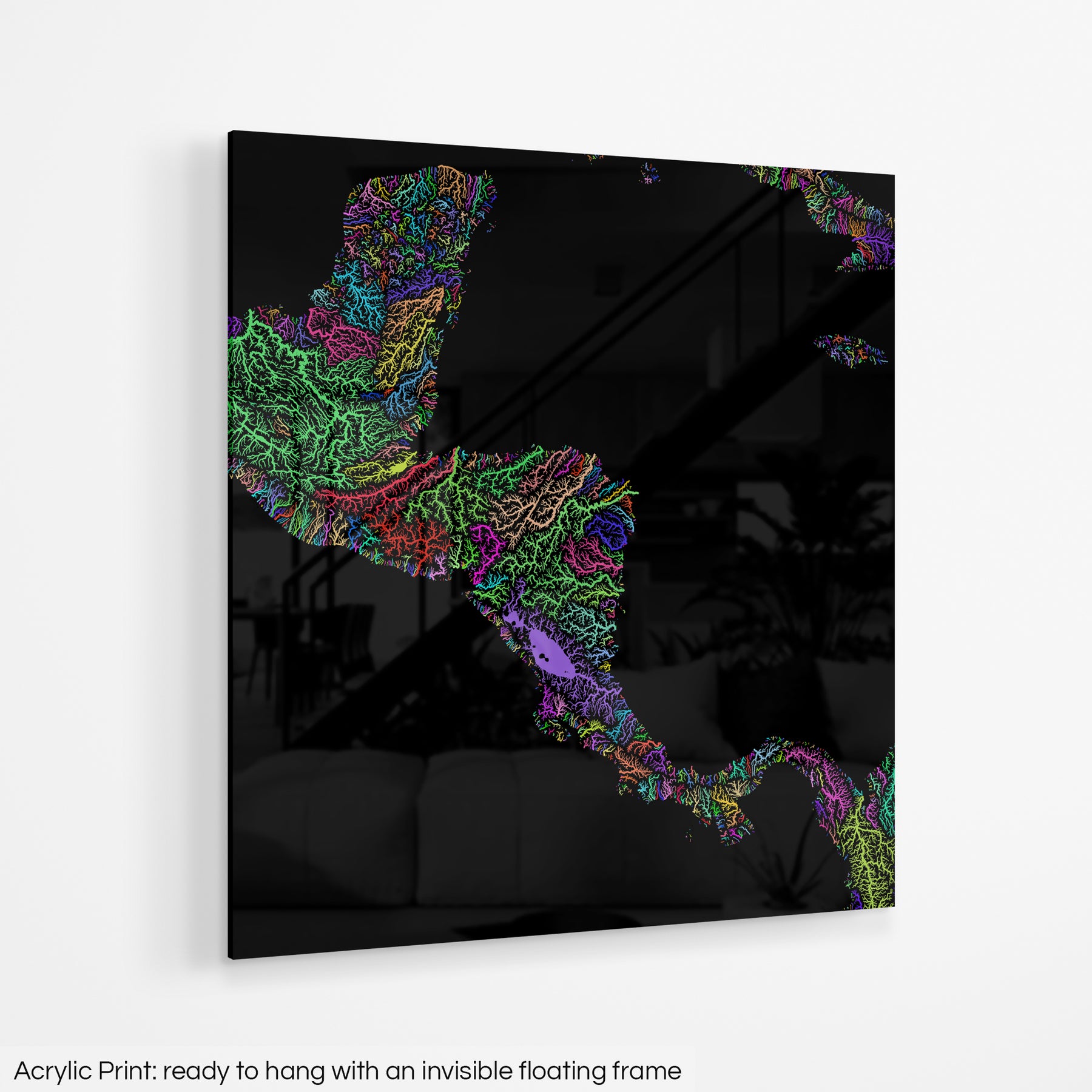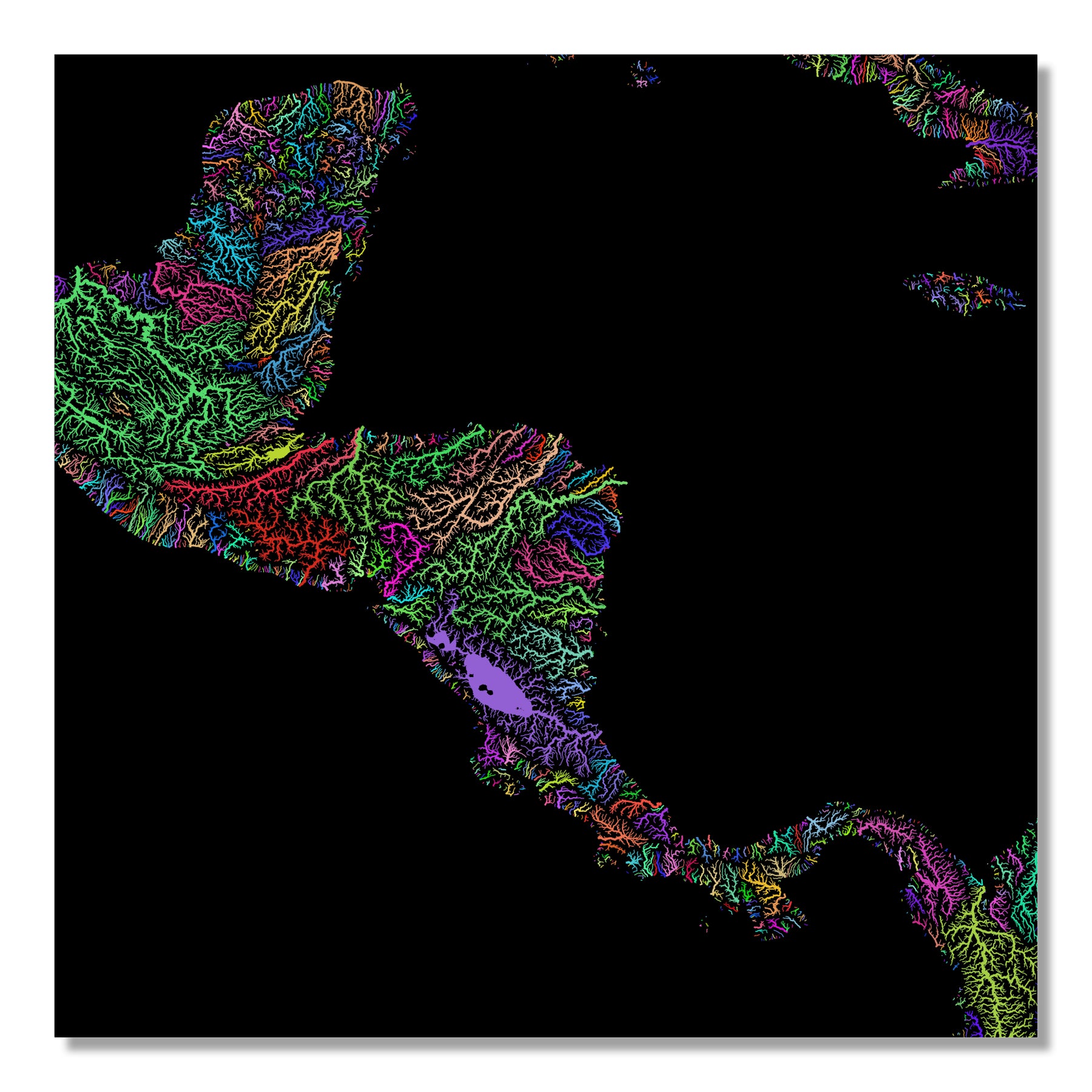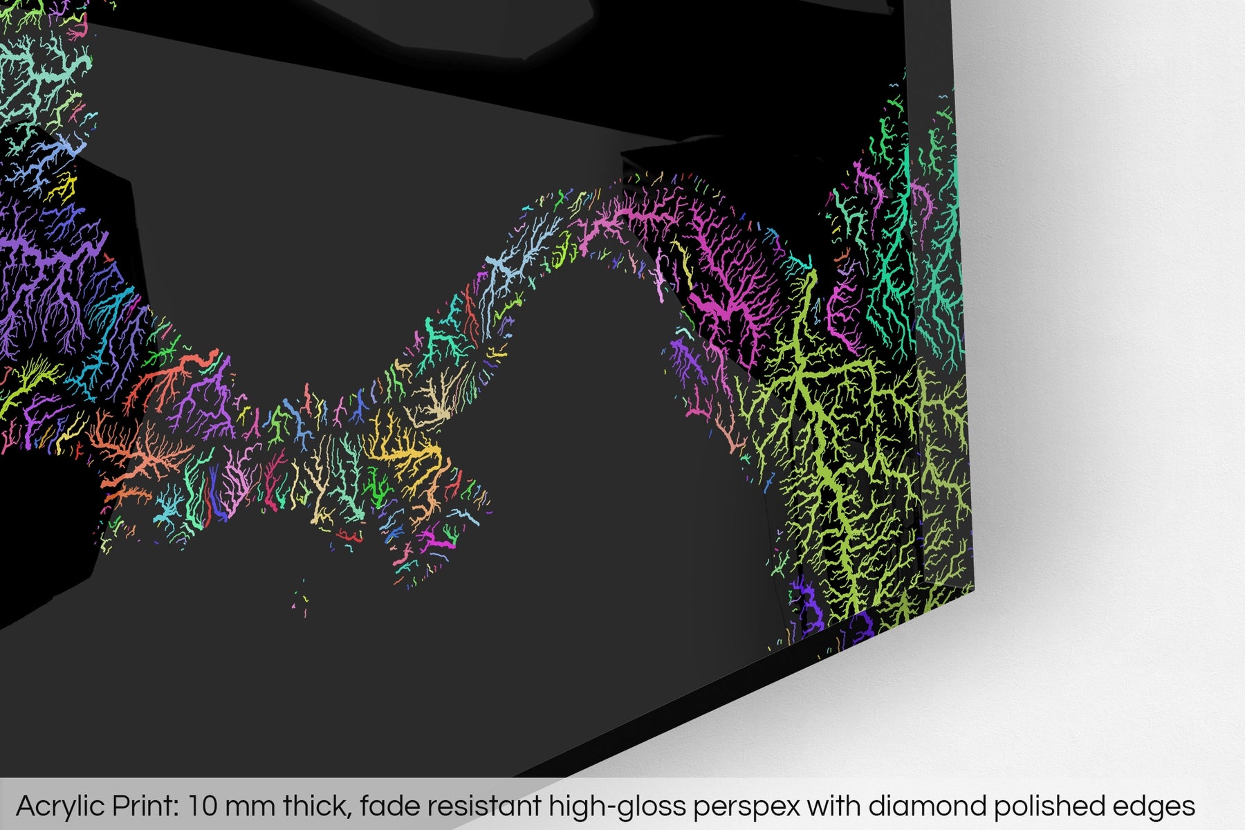 This high-resolution river basin map shows each catchment area in a different colour. Its vibrant colour scheme makes this map a lively addition to any space.