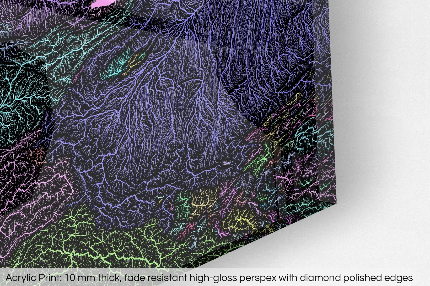 A fine art Giclée print is hand mounted onto 10mm thick high-gloss acrylic perspex that will protect your map from harmful UV light, keeping colours fresh and vivid for years to come.