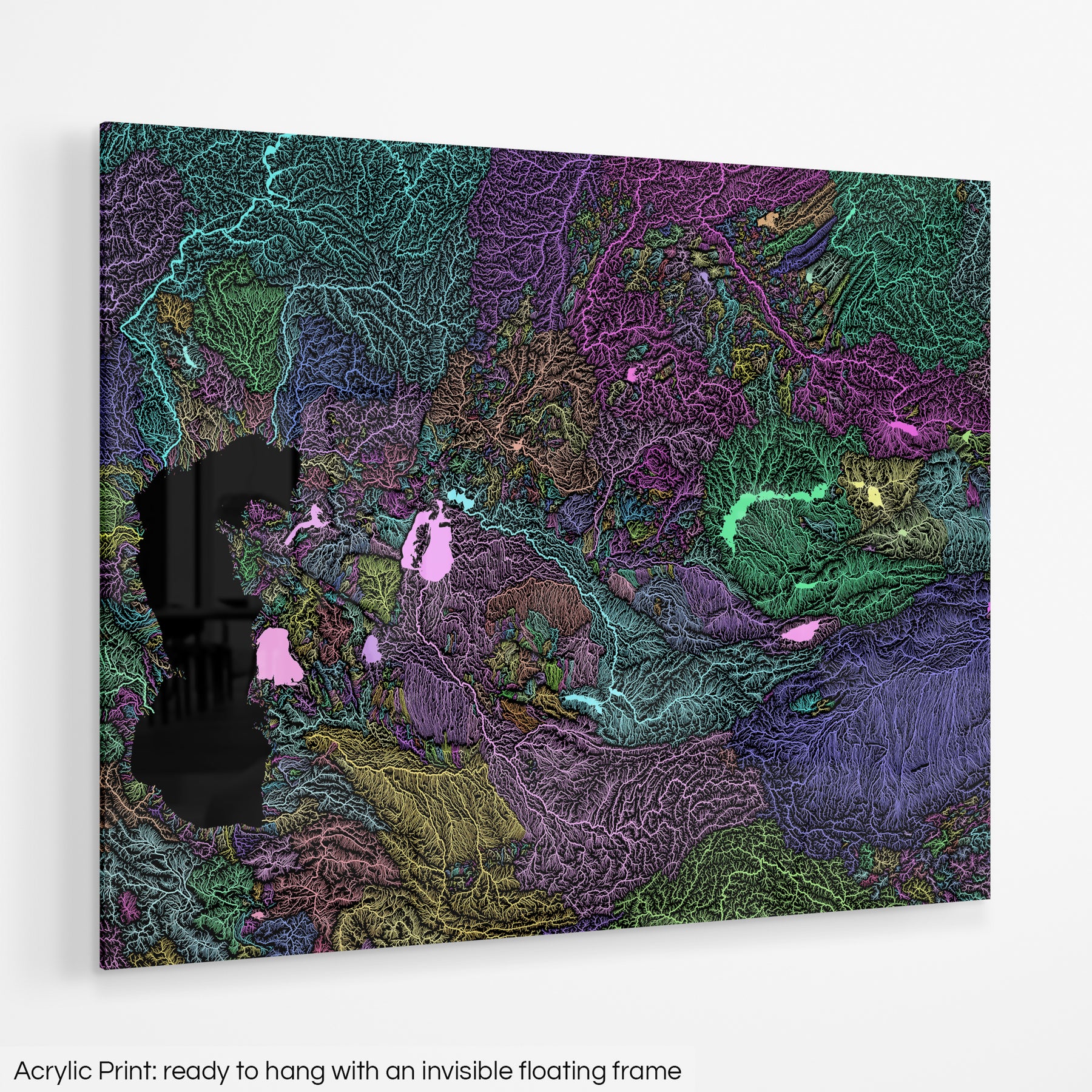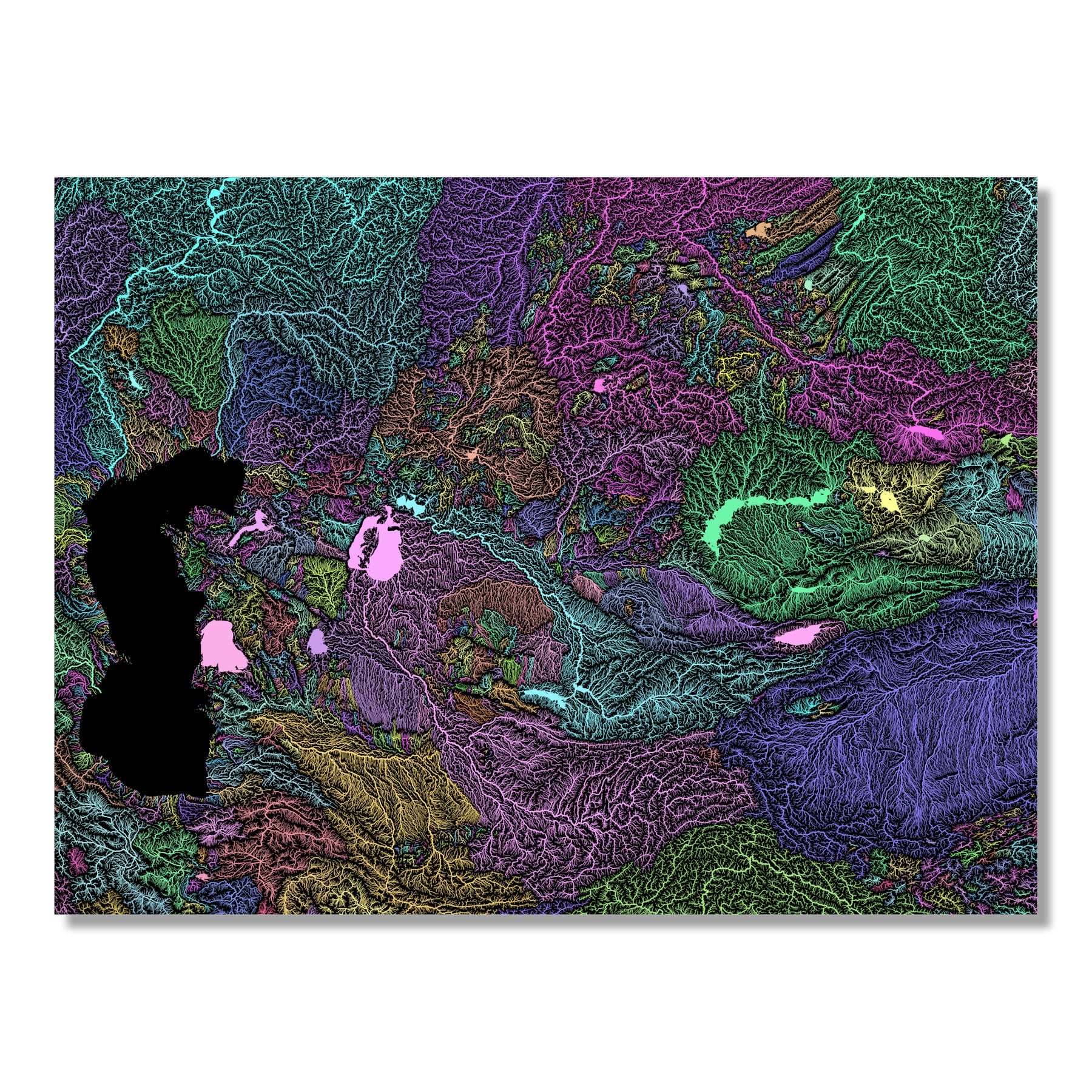 High resolution river basin map, showing each catchment area in a different colour. Thanks to its soft pastel tones the map fits well into most interiors.