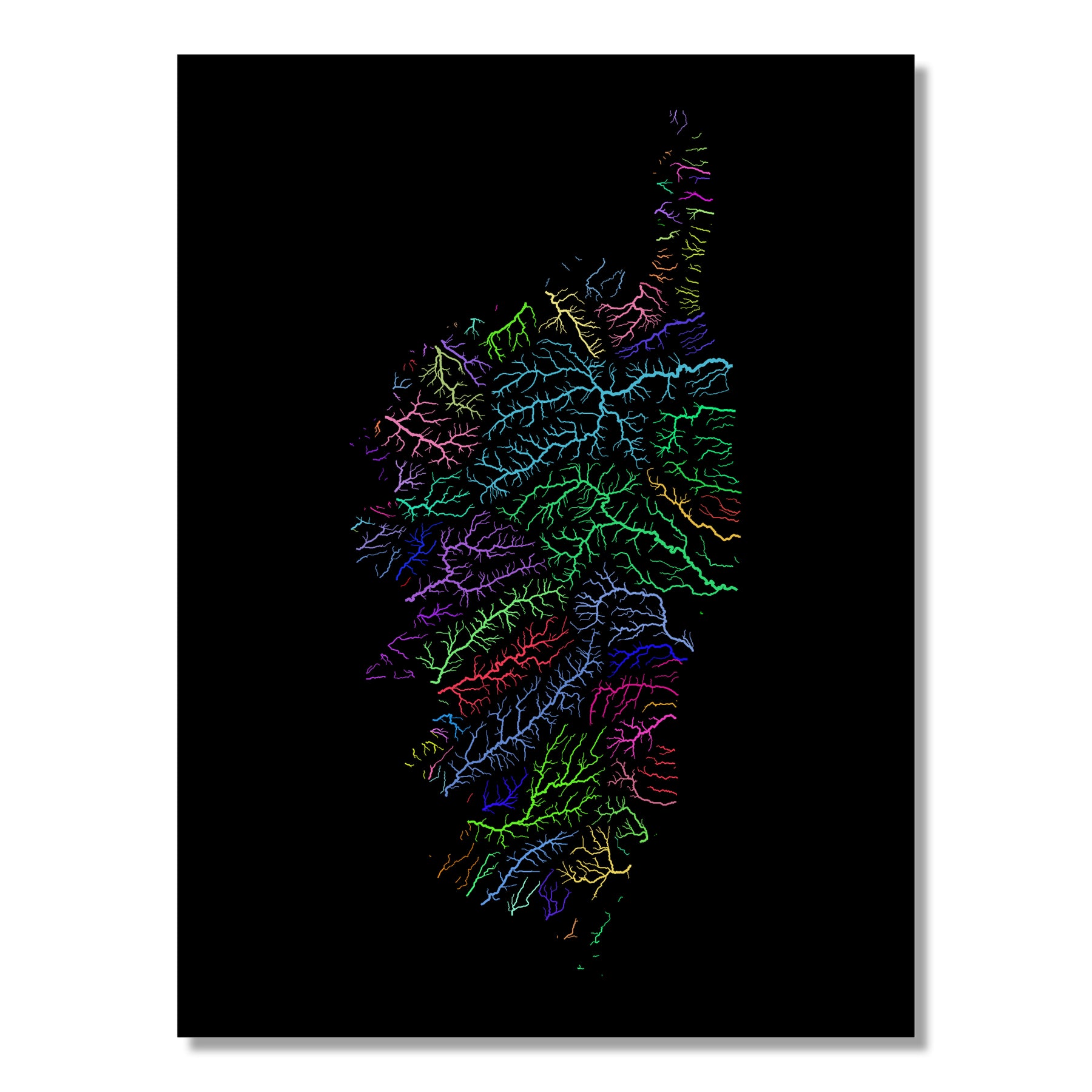 This high-resolution river basin map shows each catchment area in a different colour. Its vibrant colour scheme makes this map a lively addition to any space.