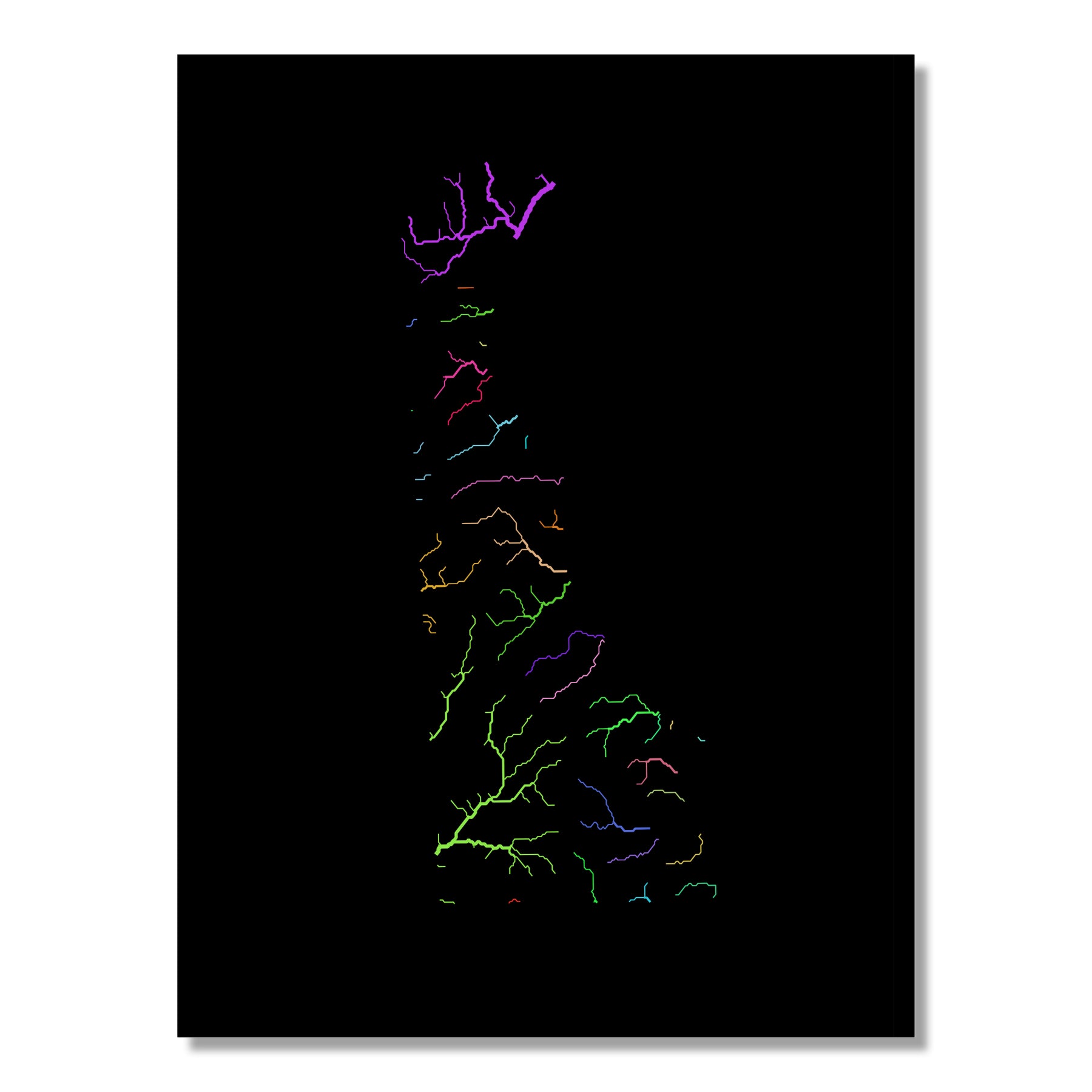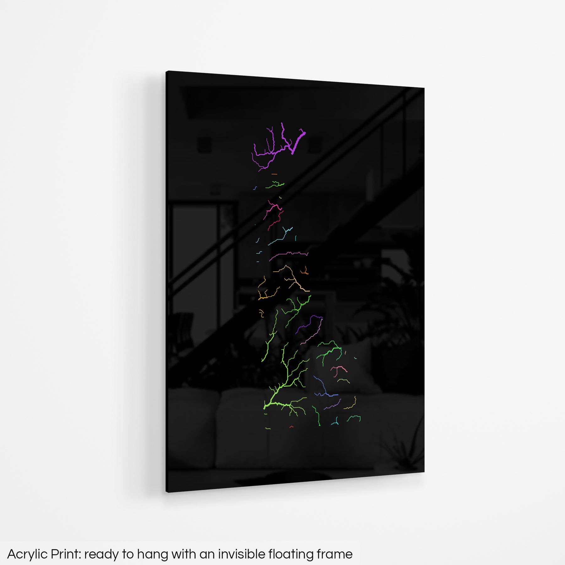 This high-resolution river basin map shows each catchment area in a different colour. Its vibrant colour scheme makes this map a lively addition to any space.
