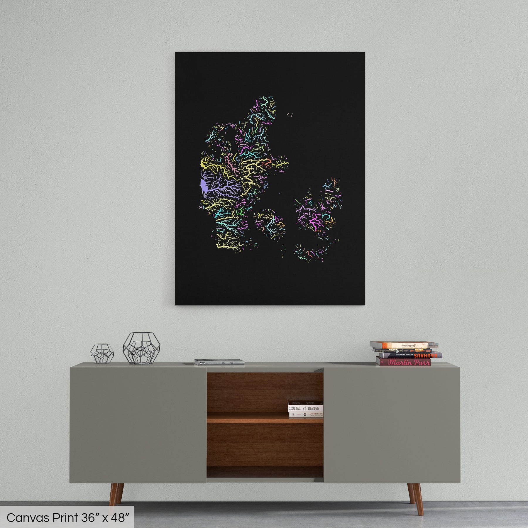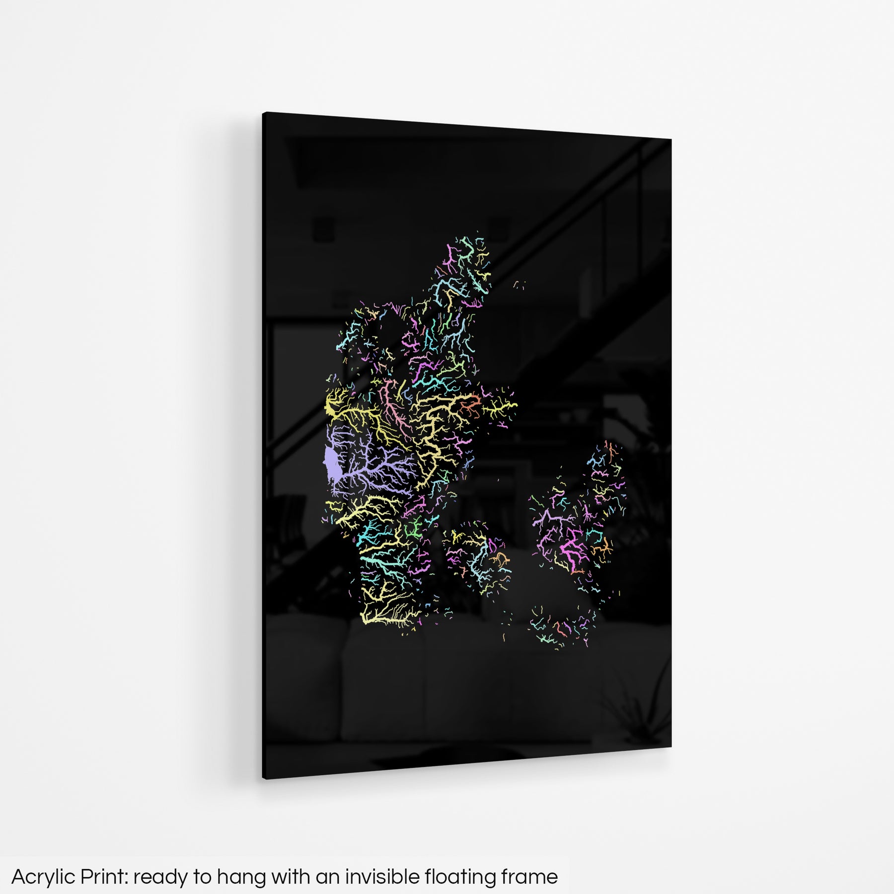 High resolution river basin map, showing each catchment area in a different colour. Thanks to its soft pastel tones the map fits well into most interiors.