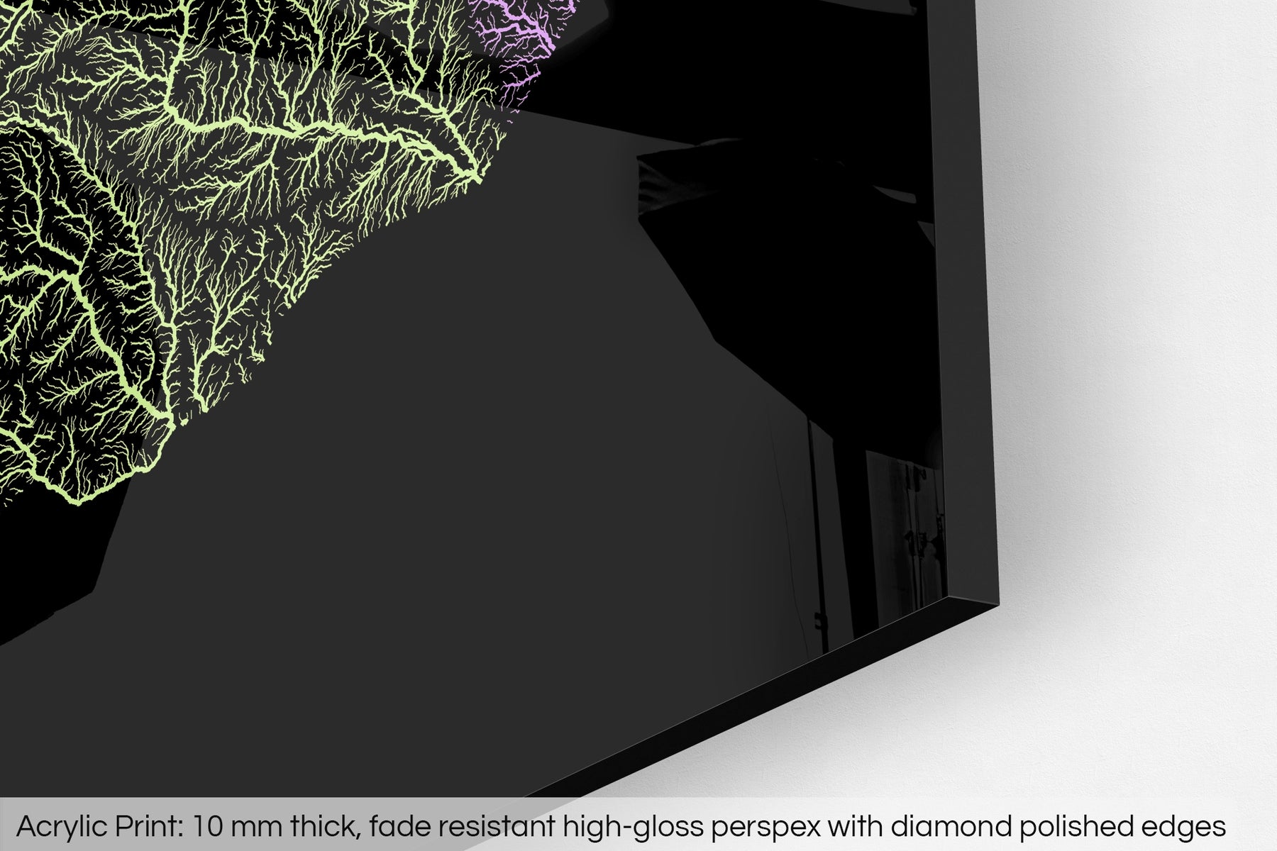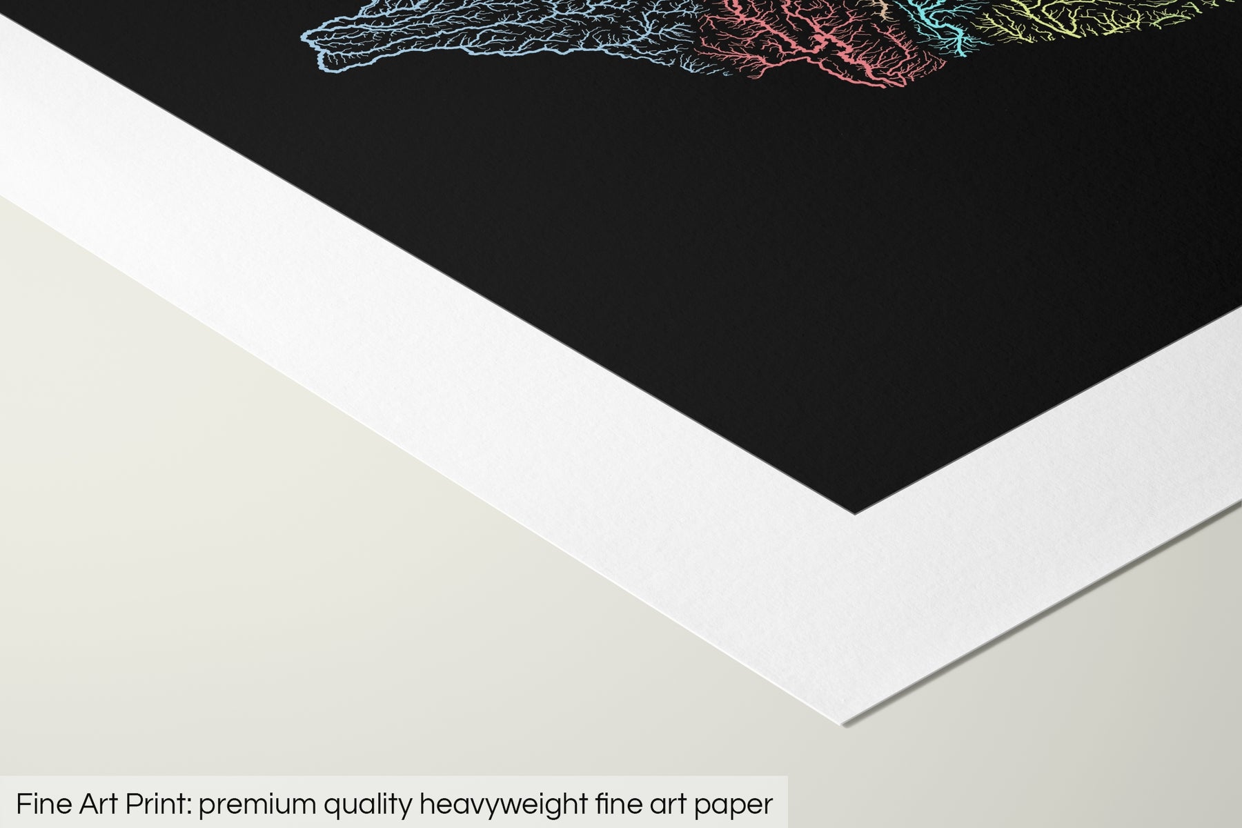 This high-resolution river basin map shows each catchment area in a different colour. Its vibrant colour scheme makes this map a lively addition to any space.