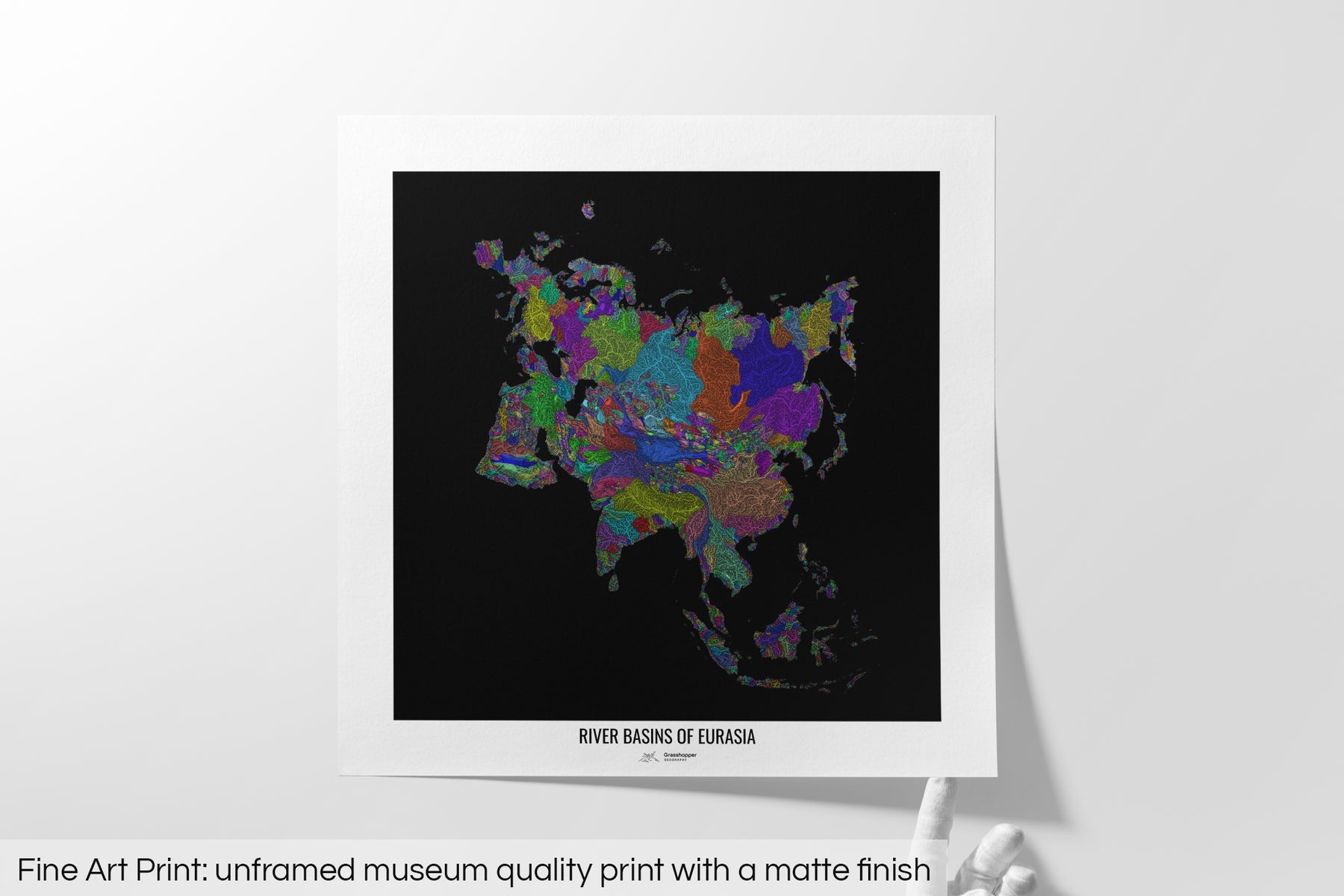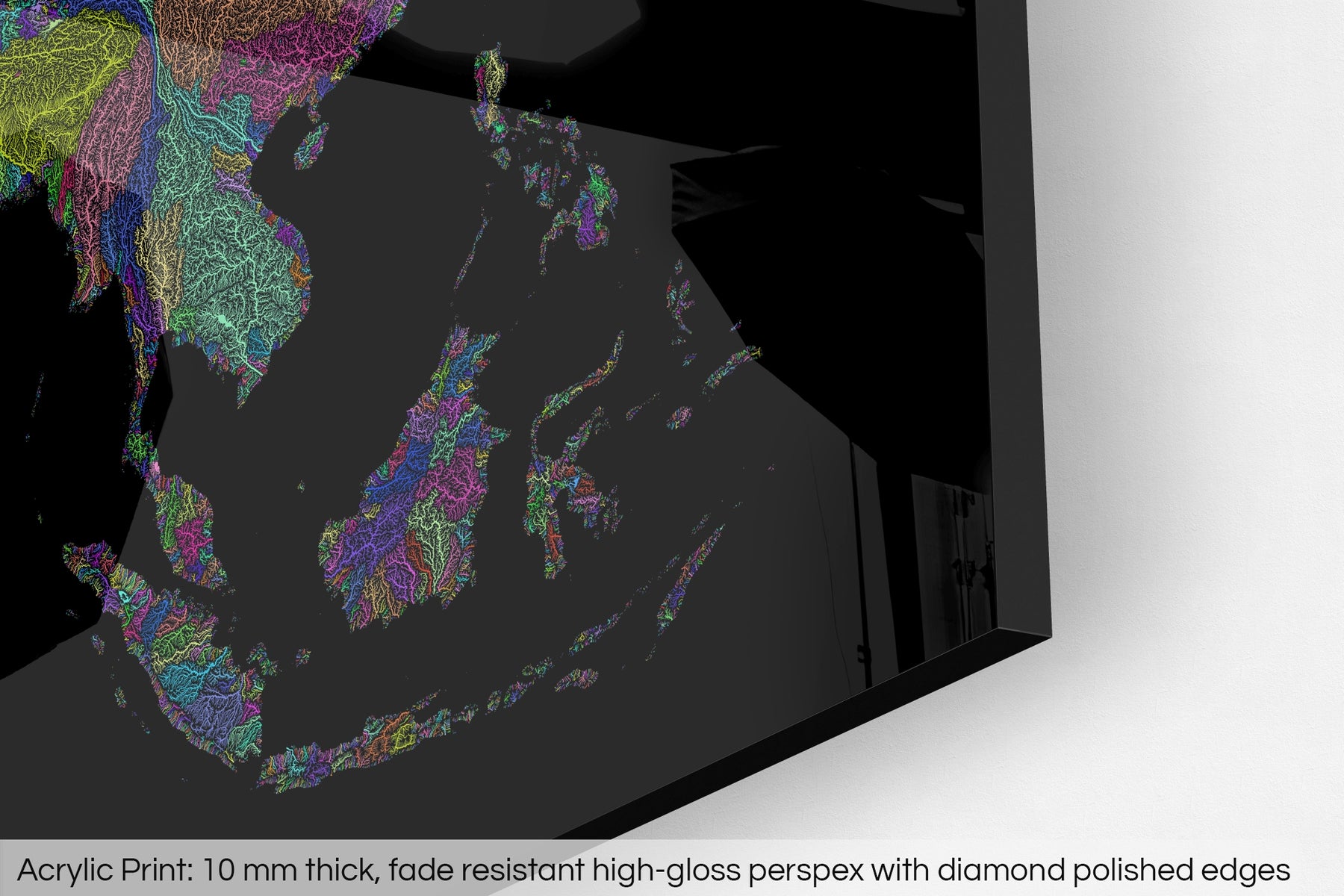 This high-resolution river basin map shows each catchment area in a different colour. Its vibrant colour scheme makes this map a lively addition to any space.