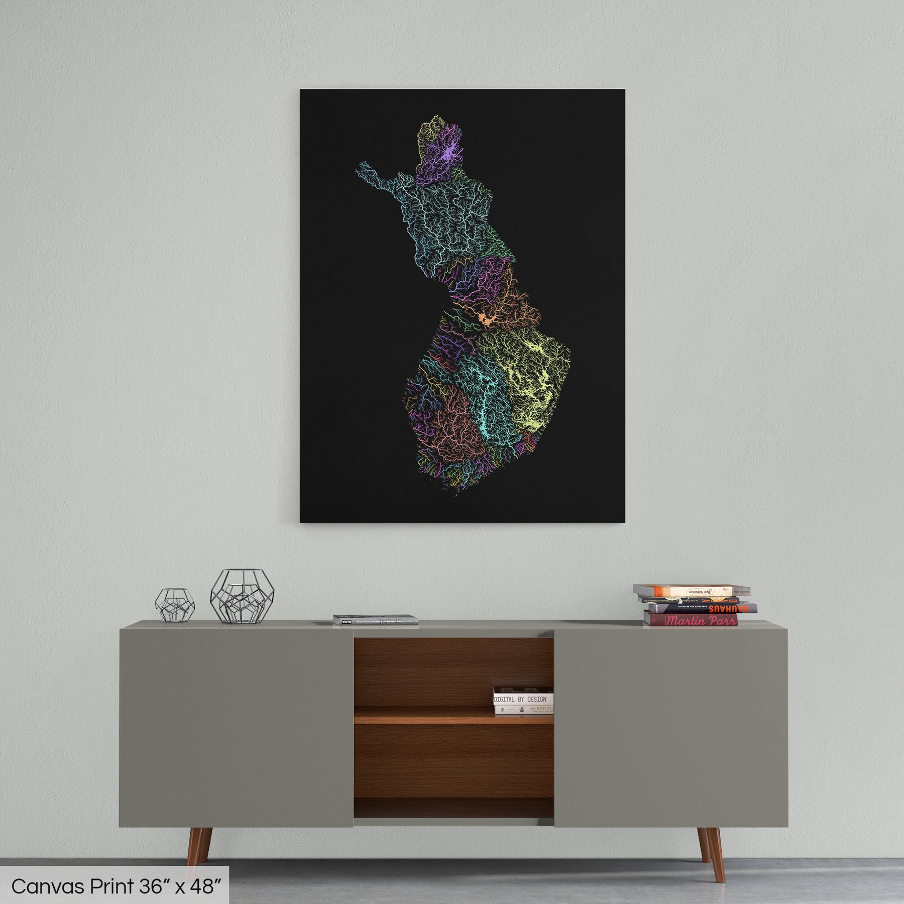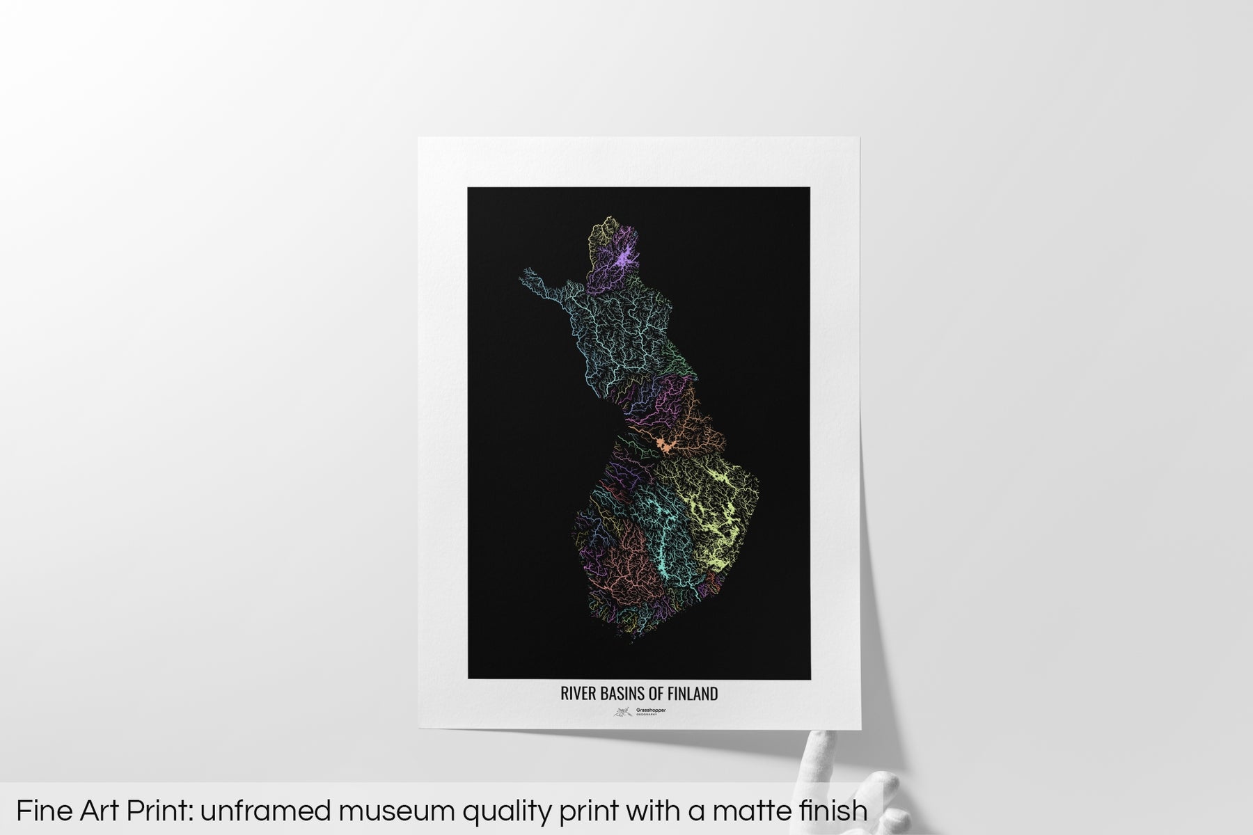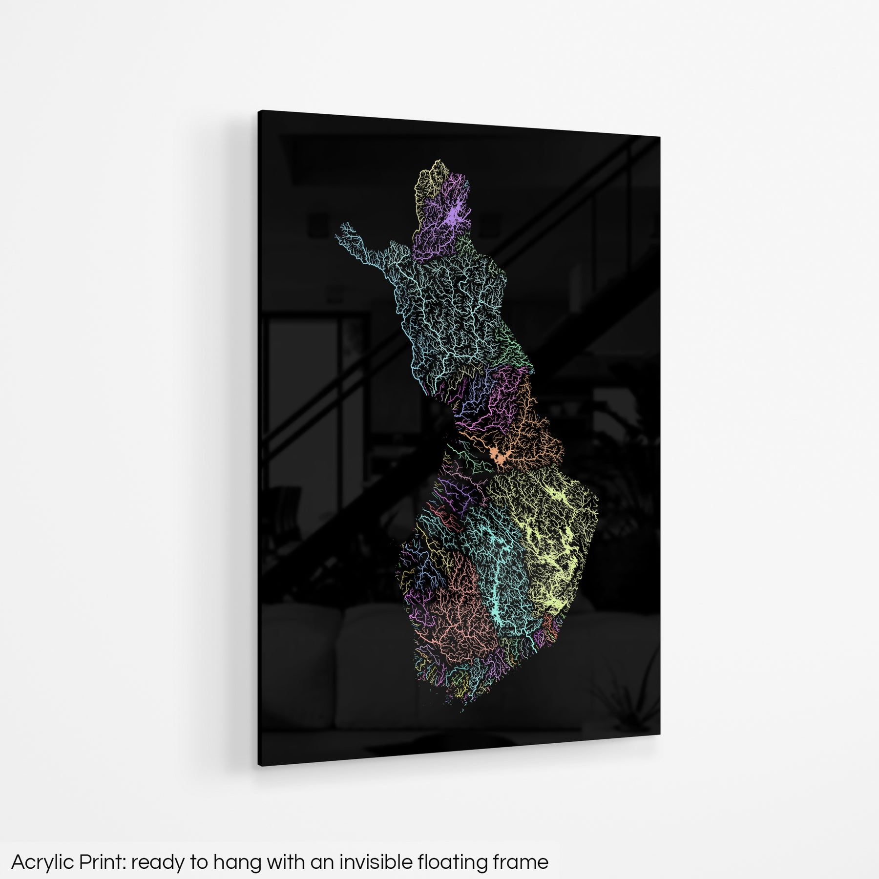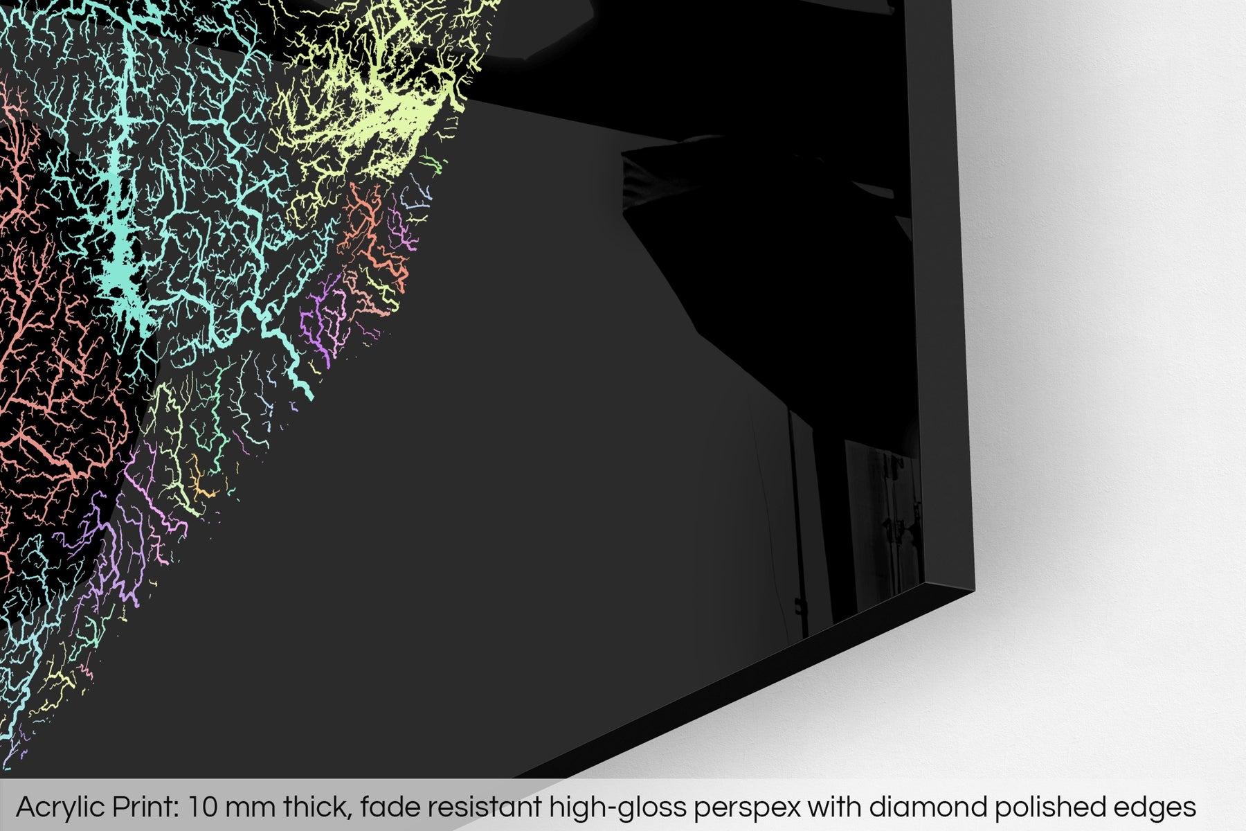 High resolution river basin map, showing each catchment area in a different colour. Thanks to its soft pastel tones the map fits well into most interiors.