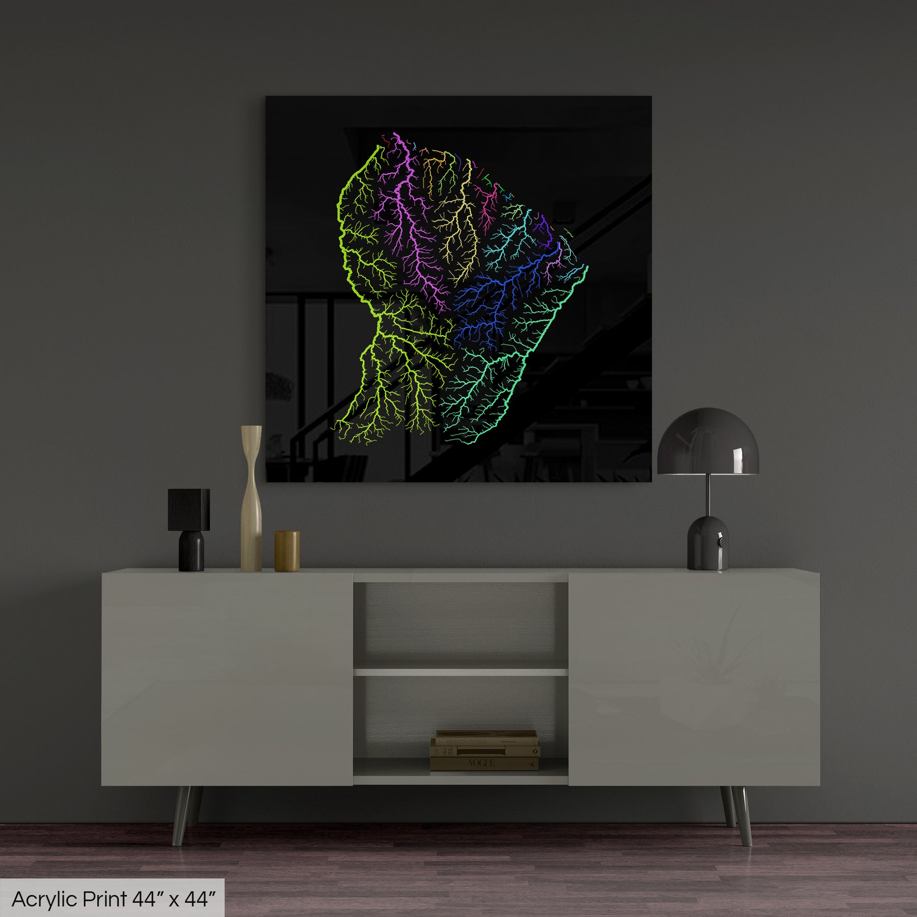 This high-resolution river basin map shows each catchment area in a different colour. Its vibrant colour scheme makes this map a lively addition to any space.
