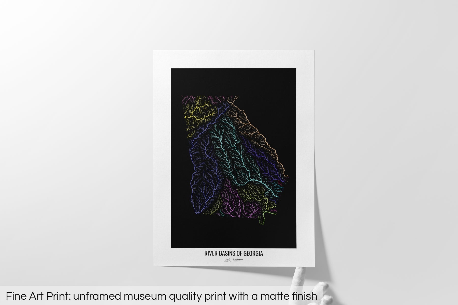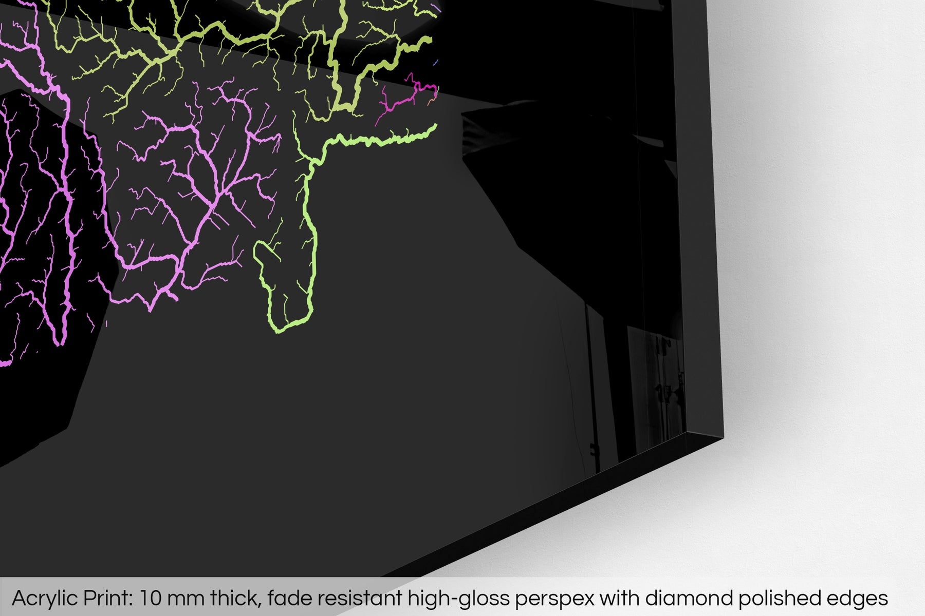 This high-resolution river basin map shows each catchment area in a different colour. Its vibrant colour scheme makes this map a lively addition to any space.