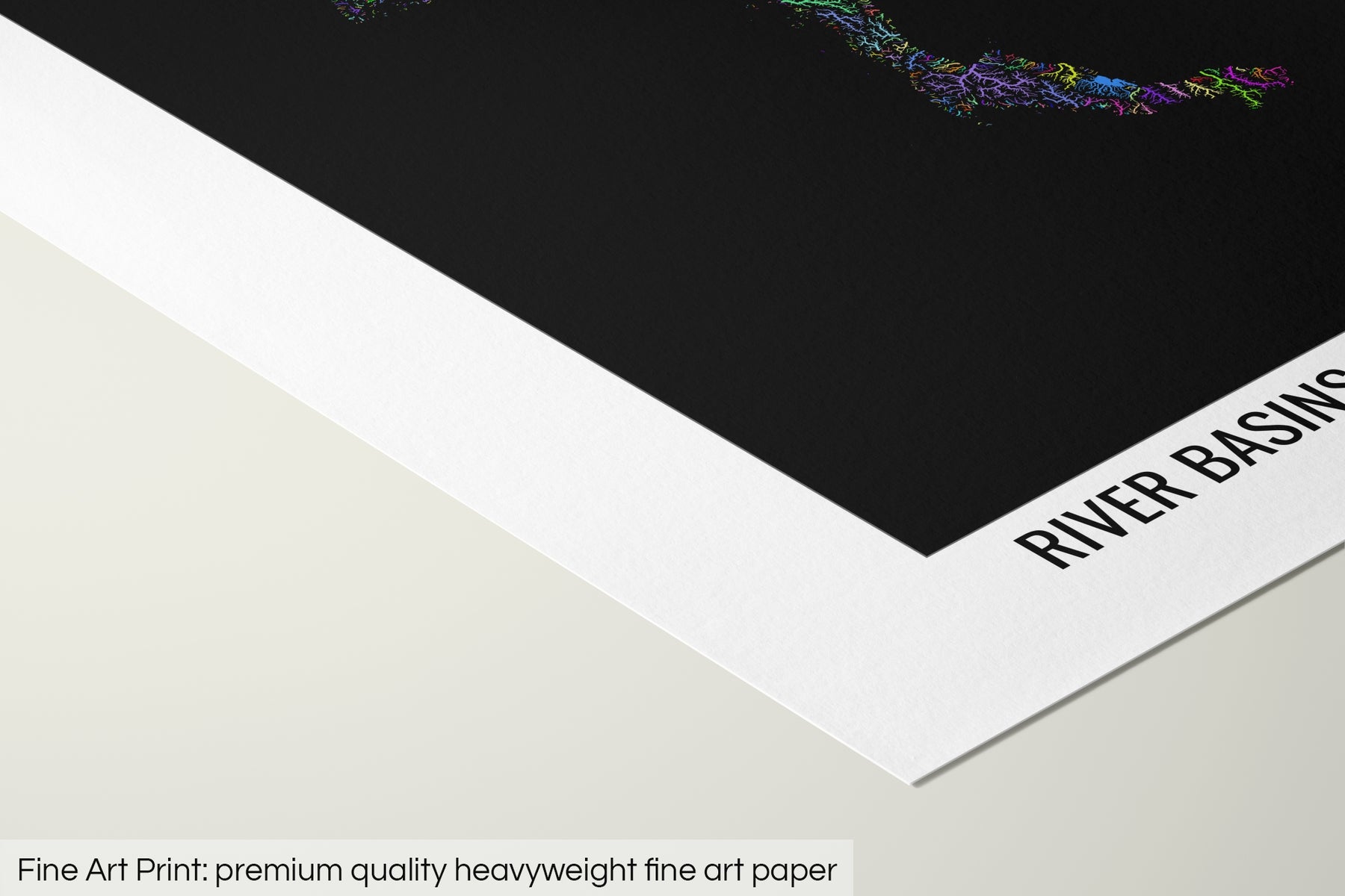 This high-resolution river basin map shows each catchment area in a different colour. Its vibrant colour scheme makes this map a lively addition to any space.