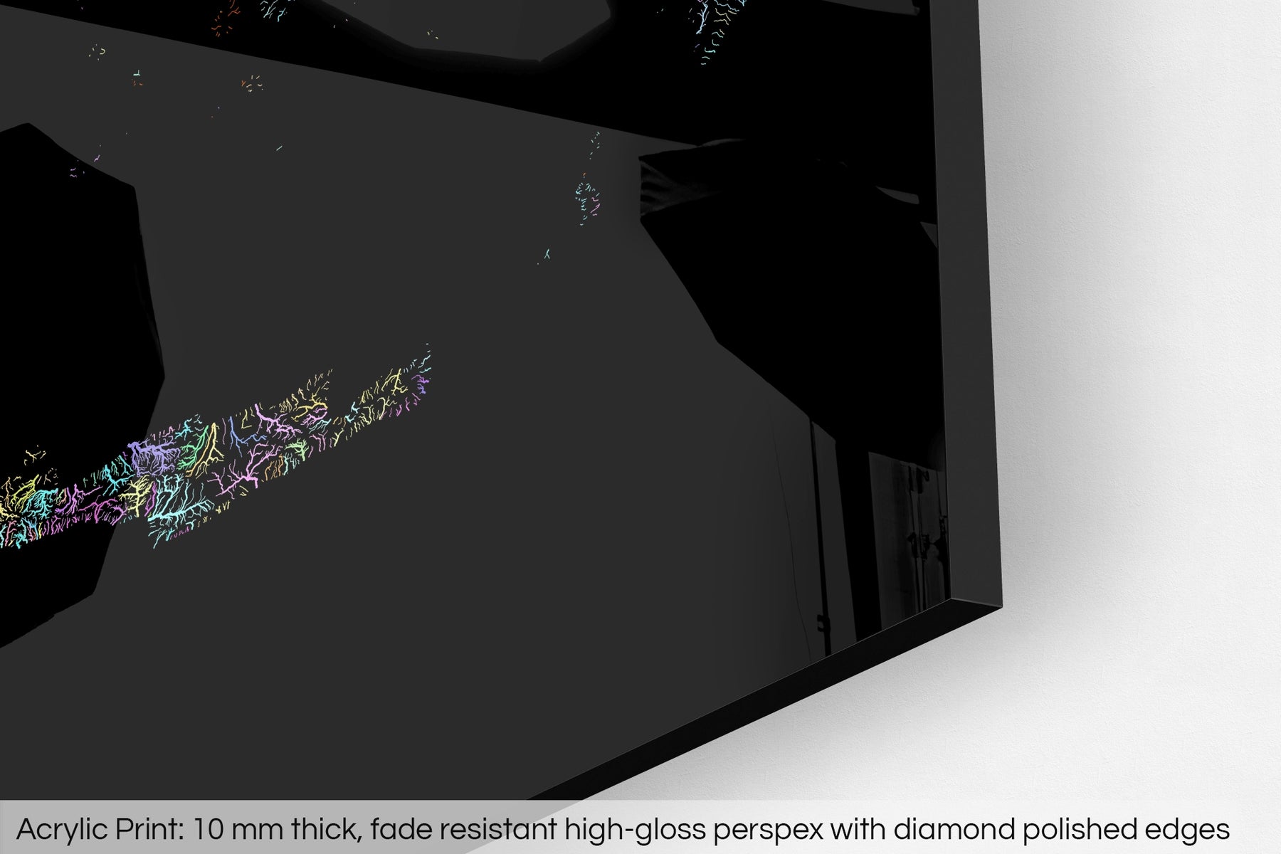 This high-resolution river basin map shows each catchment area in a different colour. Its vibrant colour scheme makes this map a lively addition to any space.