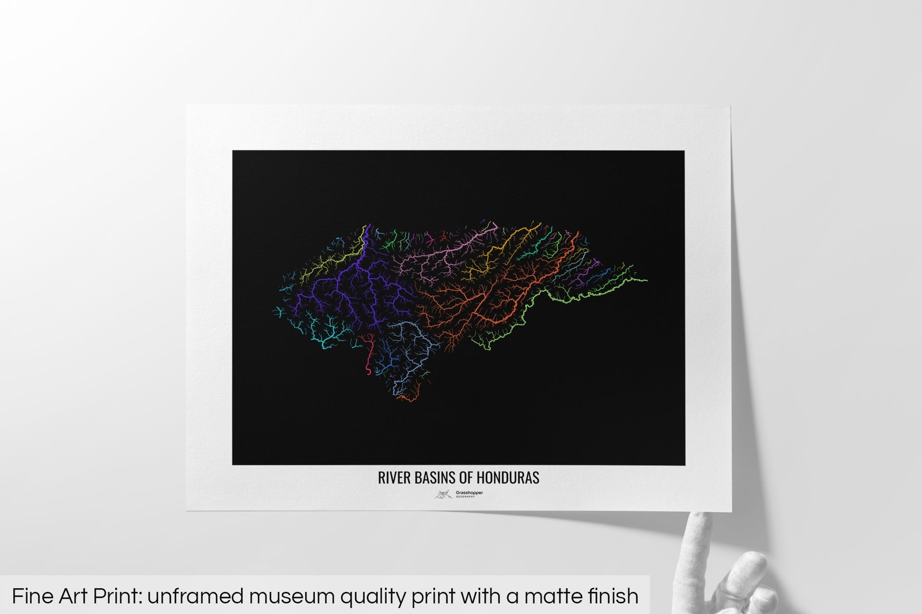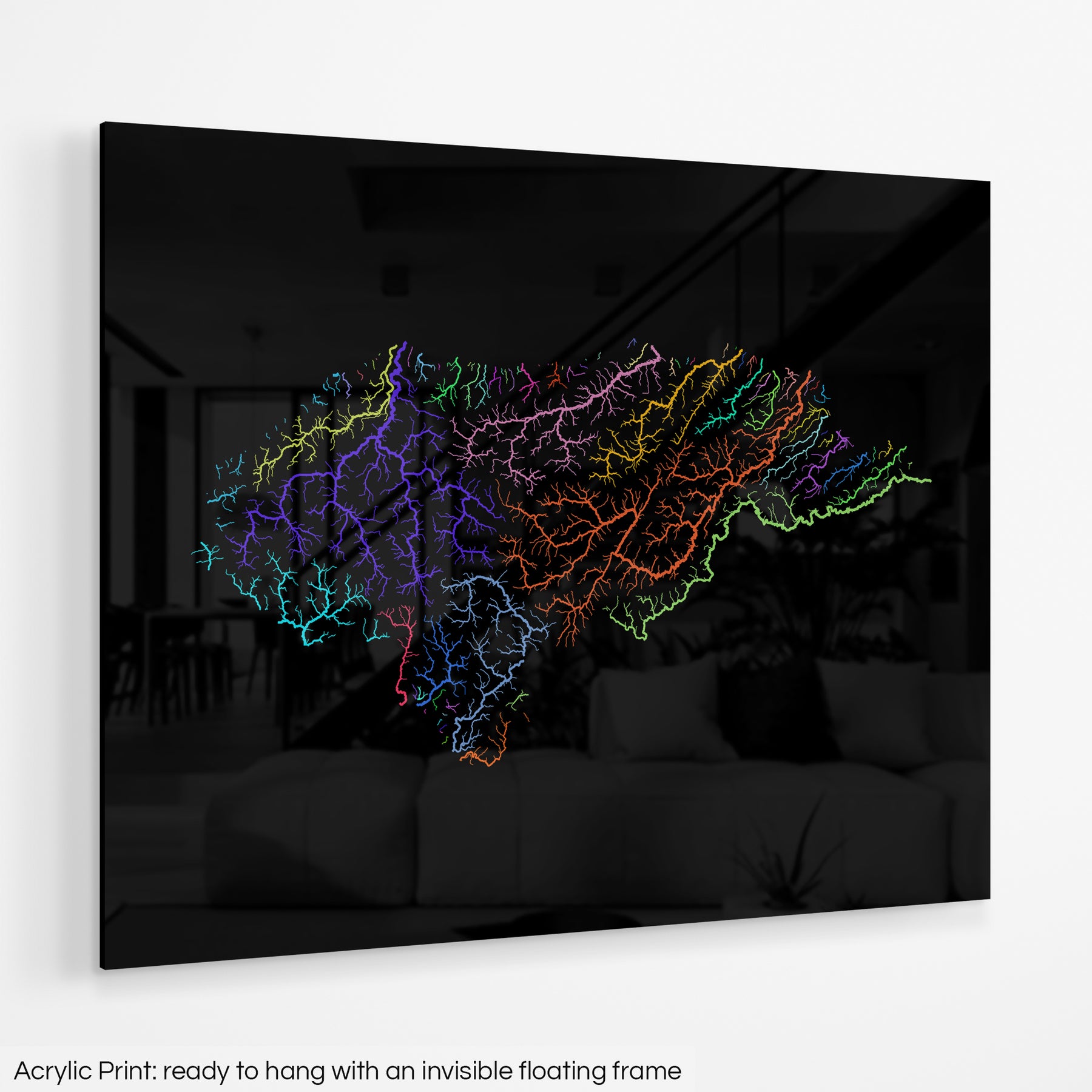 This high-resolution river basin map shows each catchment area in a different colour. Its vibrant colour scheme makes this map a lively addition to any space.