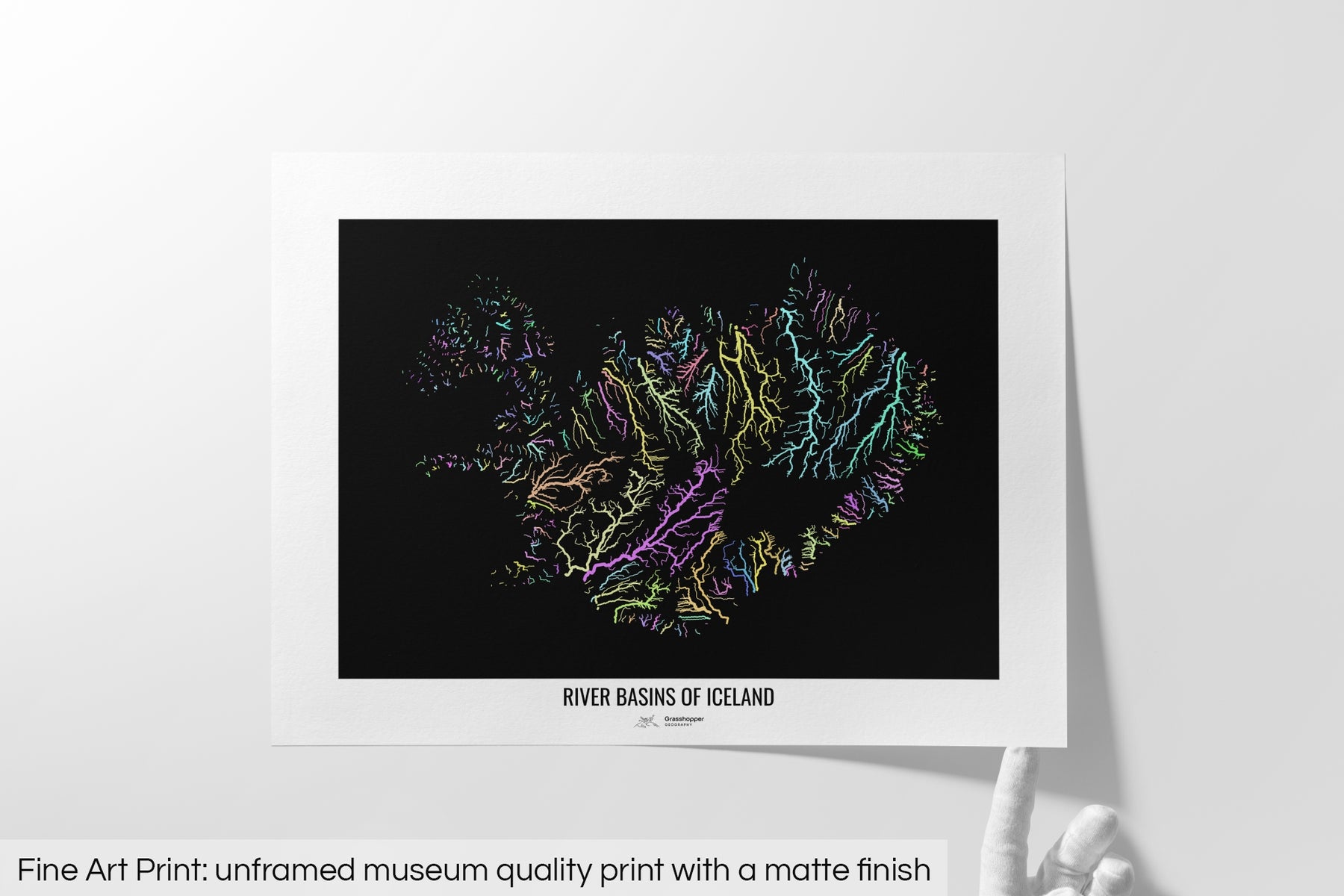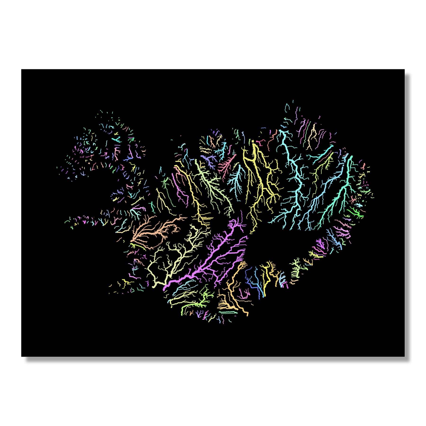 High resolution river basin map, showing each catchment area in a different colour. Thanks to its soft pastel tones the map fits well into most interiors.